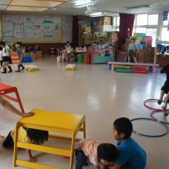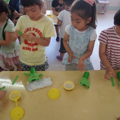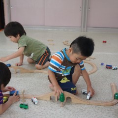 今日は月に一回の自由保育の日でした。木製トレインコーナー、かたつむり製作コーナー、かえる製作コーナー、サーキットコーナーの4つのコーナーが設けられ、自由に好きなお部屋に遊びに行きました。製作コーナーでは指先を使ったり、サーキットコーナーでは思いきり体を動かしたりと、お友達と仲良く遊ぶ姿が見られていました。かえる製作コーナーが特に大人気で、作ったものを嬉しそうに見せていましたよ。
