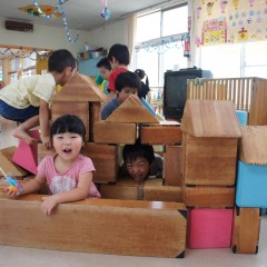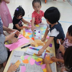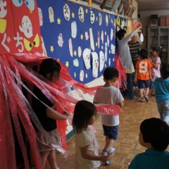21日(土)に行われた夕涼み会で使ったきもだめしをそのままコーナーにし、子どもたちは大喜びで何度も繰り返し入っていましたよ。どのコーナーも人気で、異年齢のお友達とも仲良く遊び、楽しんでいました。