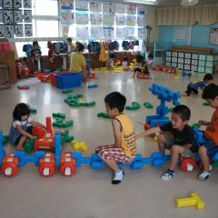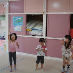 今日の自由保育は、大型ブロックコーナー、パラシュート製作コーナー、すいかのうちわ製作コーナー、ままごとコーナーでした。