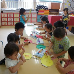 自由保育が始まると好きなコーナーに分かれてお友達と仲良く遊んでいました。すいかのうちわ製作と大型ブロックコーナーが特に人気で、作ったうちわであおいで涼んだり、大型ブロックではお友達と協力して大きい列車などを作って楽しんでいました。