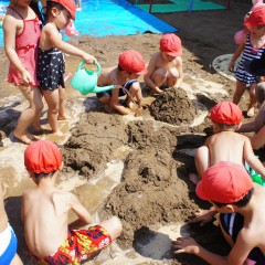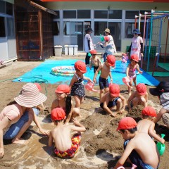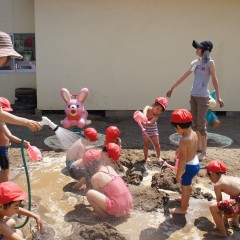 今日はお盆期間でお友達が少なかったので、全クラス合同で水遊びと泥遊びをしました。