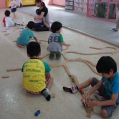 今日は運動遊びコーナー、お花のペンダントと腕輪の製作コーナー、けん玉製作コーナー、木製トレインコーナーがありました。