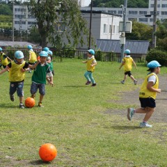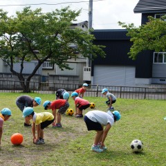 コーチのお話を聞きながら、手つなぎ鬼や、2人組になって簡単なゲームをしたあと、ボールを蹴って転がしたり足で止めたりすることに挑戦しました。難しそうでしたが、お友達と一緒に楽しみながらがんばっていました。最後に2チームに分かれて試合をし、一生懸命ボールを追いかける姿はとても生き生きとしていましたよ!!