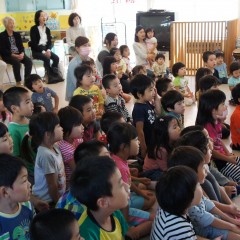 今日は十五夜集会があり、子ども達はお月様の動くパネルを見ながら由来を聞きました。