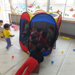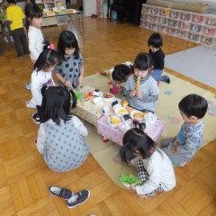 すみれ組のお部屋は「ままごとコーナー」 ちゅうりっぷ組のお部屋は「ボールハウス・大きなブロック・ウレタンブロックコーナー」にして自由保育を行いました。