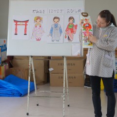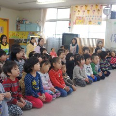 元気に歌をうたい、楽しく七五三集会が始まりました。七五三の由来や歳によって着る着物や袴が違うことを絵で分かりやすくお話し、集中して聞いていました。