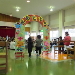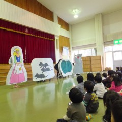 誕生児のお友だちはステージの上に上がり、インタビューを受けたり、とても嬉しそうにしていました。 おたのしみのくり抜きペープサート「シンデレラ」のお話もみんなで楽しく見ていました。