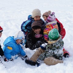 雪遊びは、中央公園へ出掛け、一面真っ白な雪の上を思いきり走ったり寝転がったりと、自由遊びを楽しんだあと、宝探しや記念撮影をしました。お友だちと思いきり遊び、みんなとても楽しかったようです。