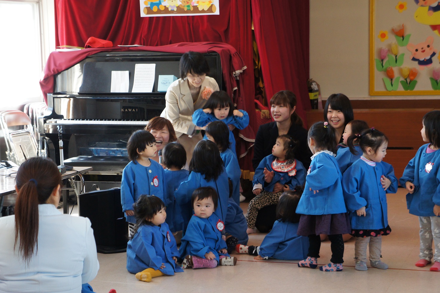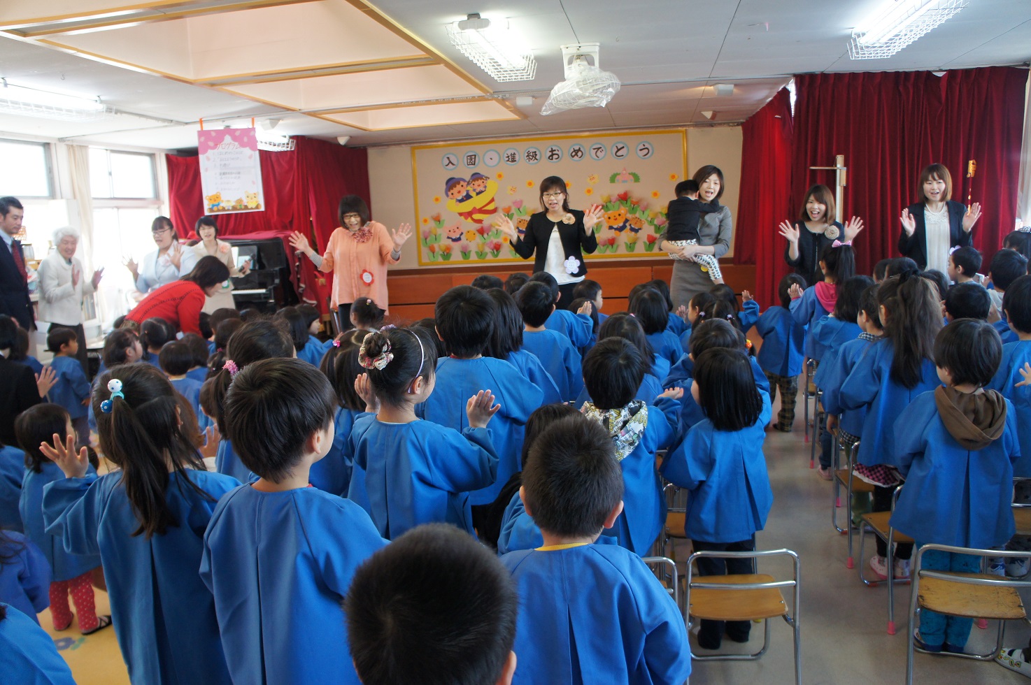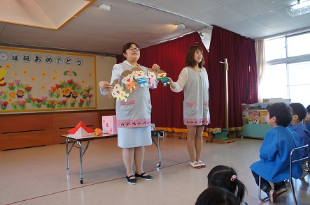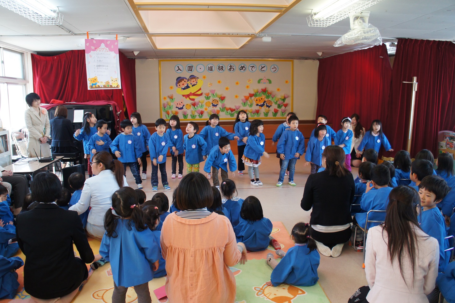 本園の遊戯室で第39回桜ケ丘保育園進級式がありました。今日から新年度の始まりです。ひとつ上のクラスに上がり、いつもと違う雰囲気に少し緊張していた様子でしたが、クラスごとに担任の先生にお名前を呼ばれると可愛い笑顔を見せ元気にお返事していました。またクラス発表では、手遊びや遊戯など楽しみながら発表し元気いっぱいに進級式に参加することができました。