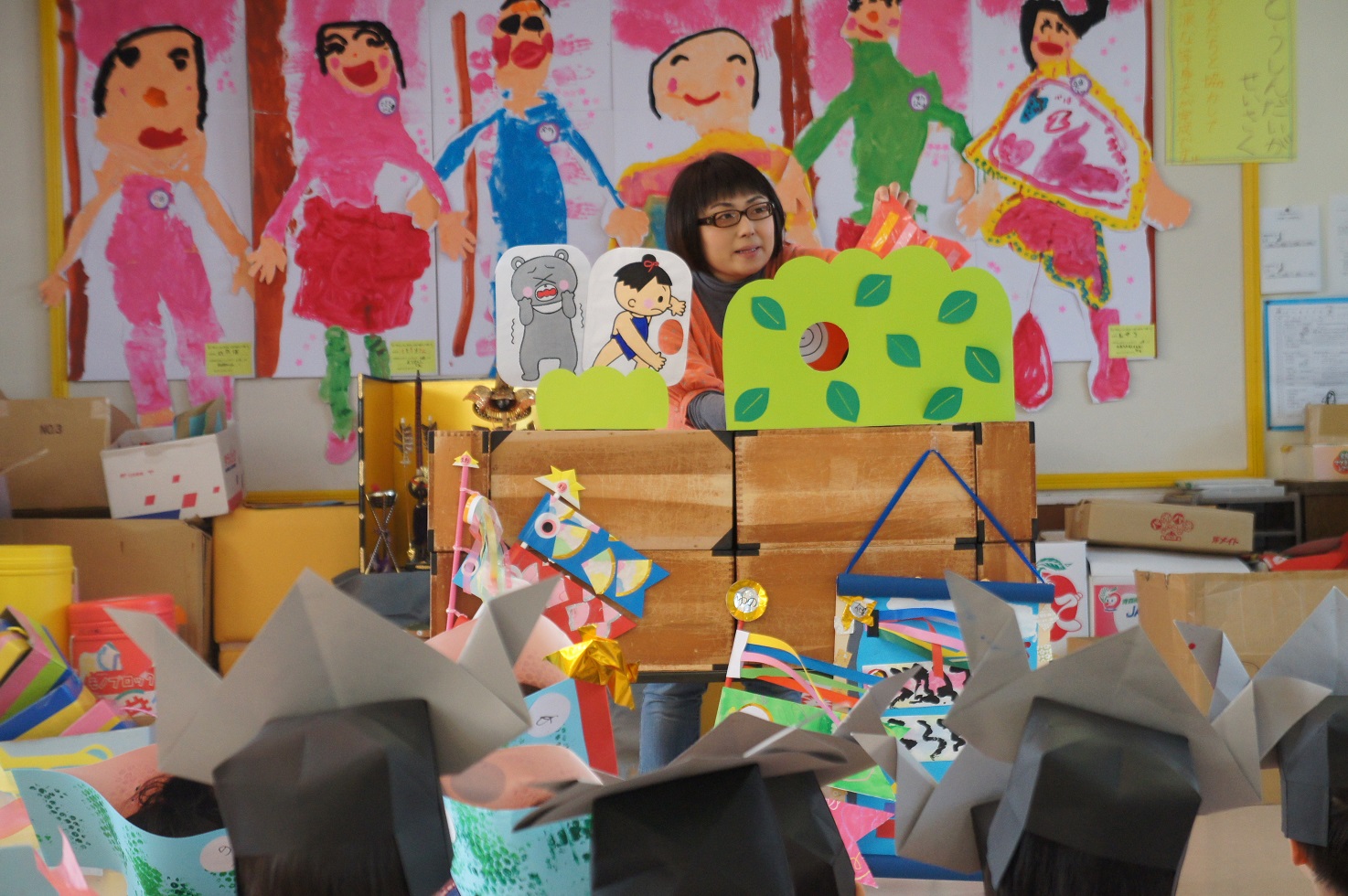 少し緊張しながらもインタビューに答え、和やかな雰囲気の中で行われていました。ペープサートの「あっぱれ!ぎんたろう」では、とても集中し真剣なまなざしで見ていましたよ。