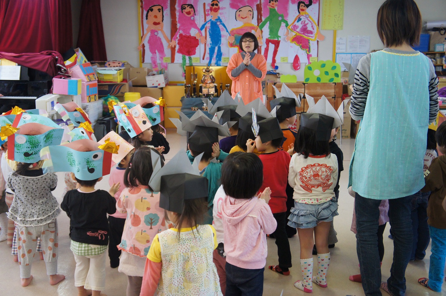 端午の節句の由来を聞き、自分たちで作ったかぶとやこいのぼりを紹介してもらいました。