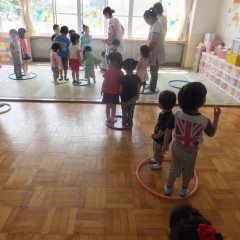 自由保育では園庭で砂遊びをしたり、保育室でフープを使って遊びました。
