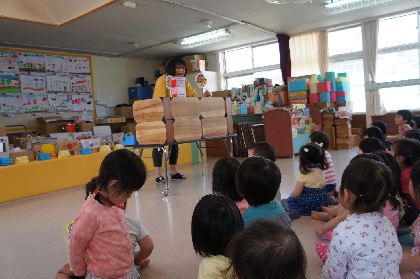 5月生まれのお友だちは元気にインタビューに答えていました。担任の先生お手製のプレゼントをお友だちから受け取りとっても喜んでいました。おたのしみでは、「ポンタの自動販売機」を集中して見て、ときおり歓声をあげ喜んでいました。