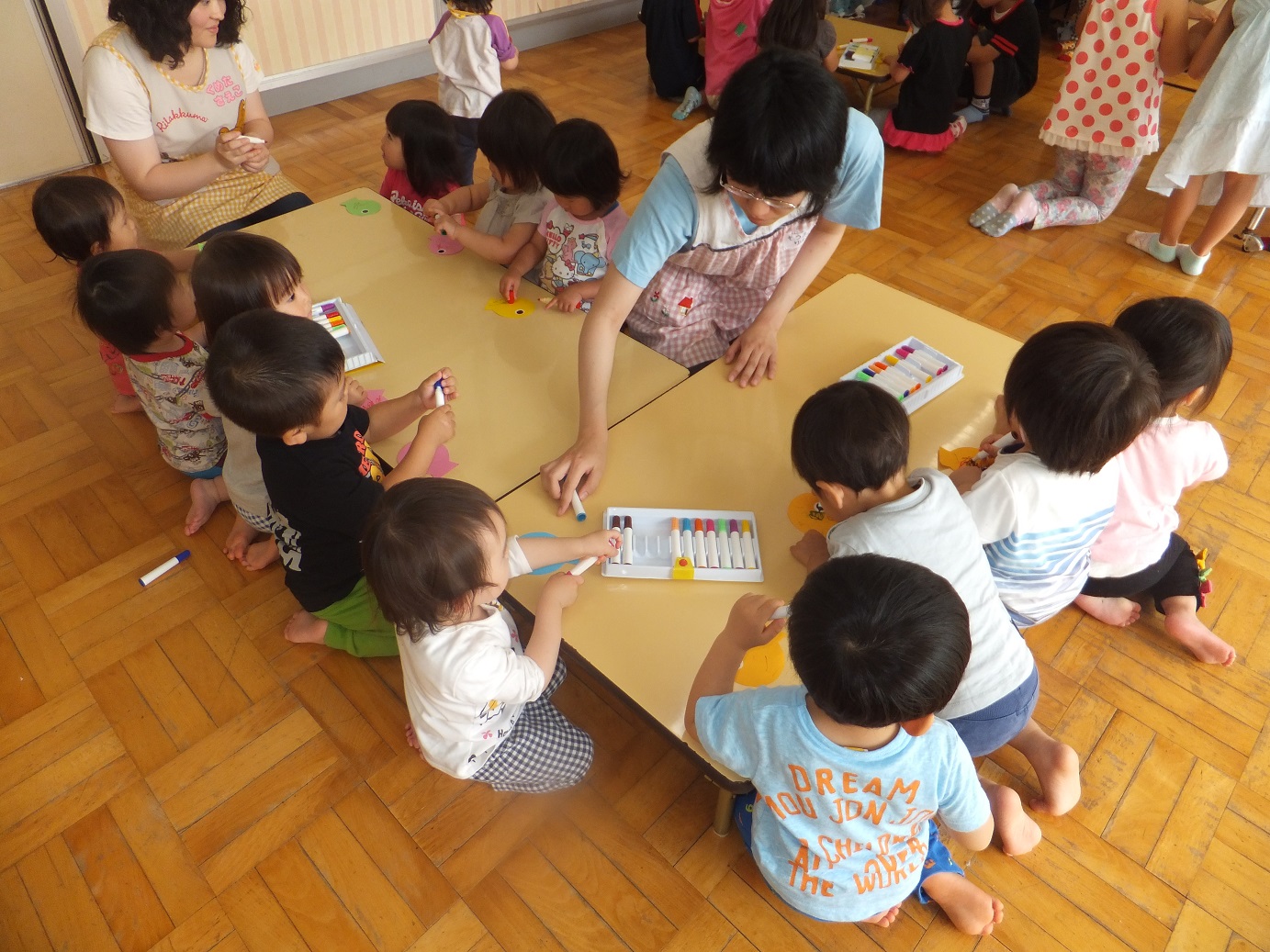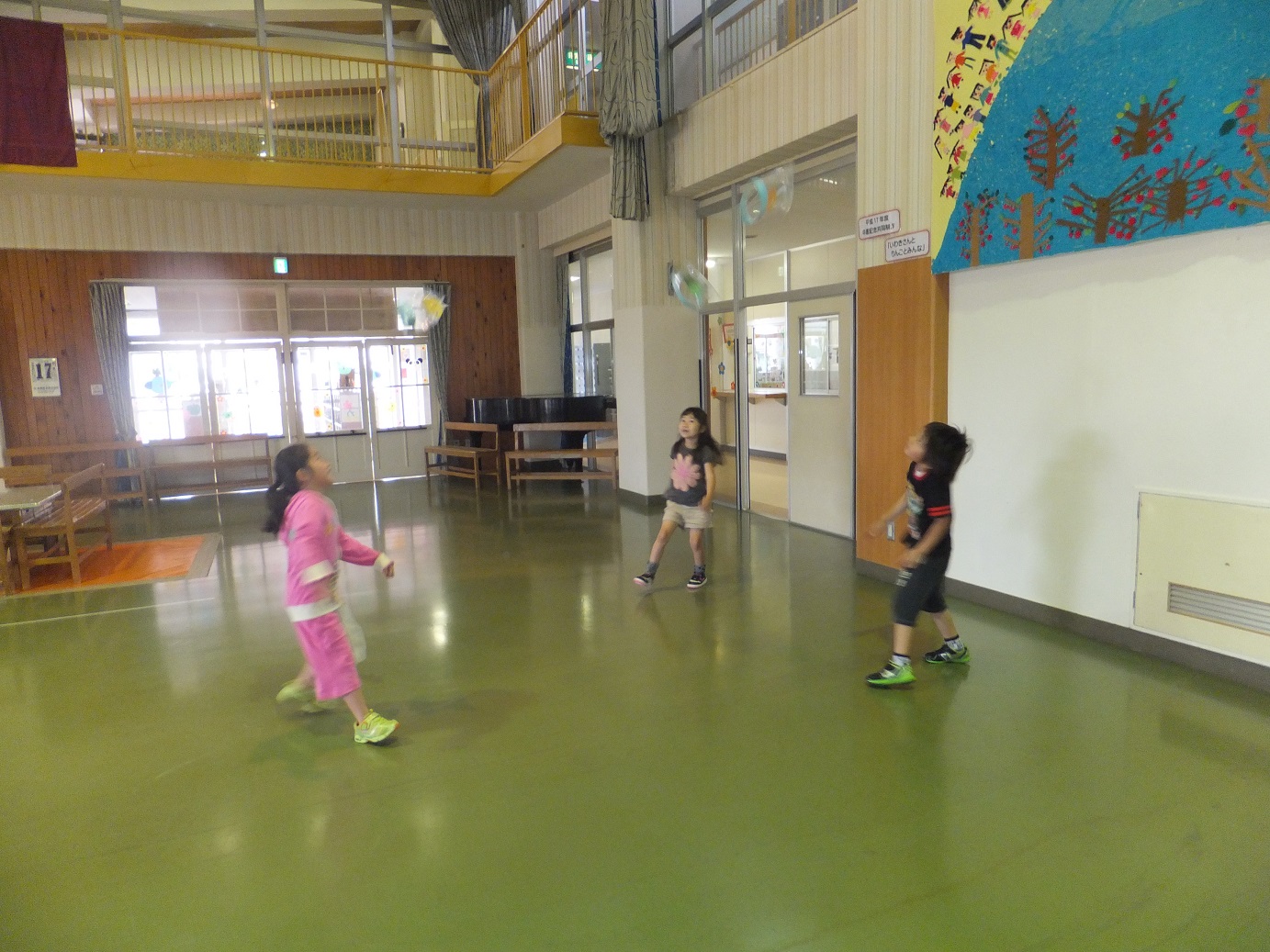 ちゅうりっぷ組のお部屋で、魚の顔や模様を描き、ミニ水族館を製作しました。袋を投げるとふわっと着地する手作りおもちゃなので、完成後はホールへ行き、みんなでとばして遊びました。何度も投げて楽しむ様子が見られましたよ。その後はフープやボールで自由遊びを楽しみました。