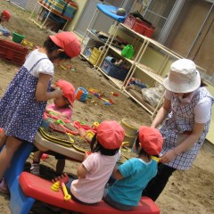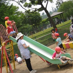 1,2歳児から5歳児まで一緒に楽しく遊ぶ姿が見られ、テーブルに座ってままごと遊びをする姿や、すべり台などの運動遊具で楽しく遊んでいました♪