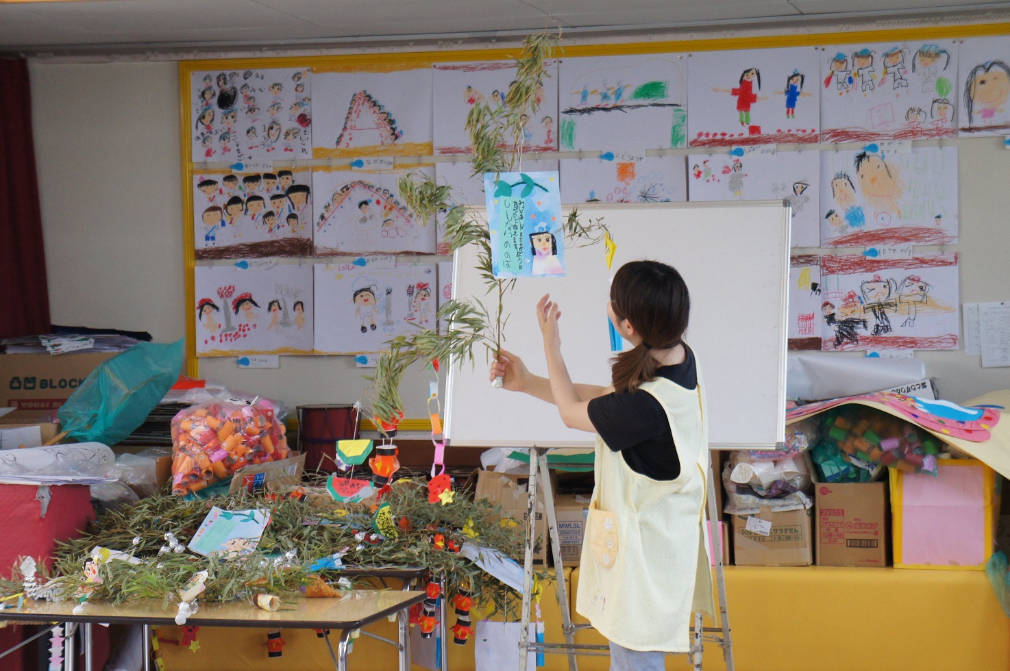 全クラスで元気にたなばたを歌い、各クラスの笹飾りを見ました。 その後、パネルシアター「織姫と彦星」をとても真剣に見ていました。 「今日、織姫と彦星会えるといいなあ」と、かわいい声が聞こえてきていました。