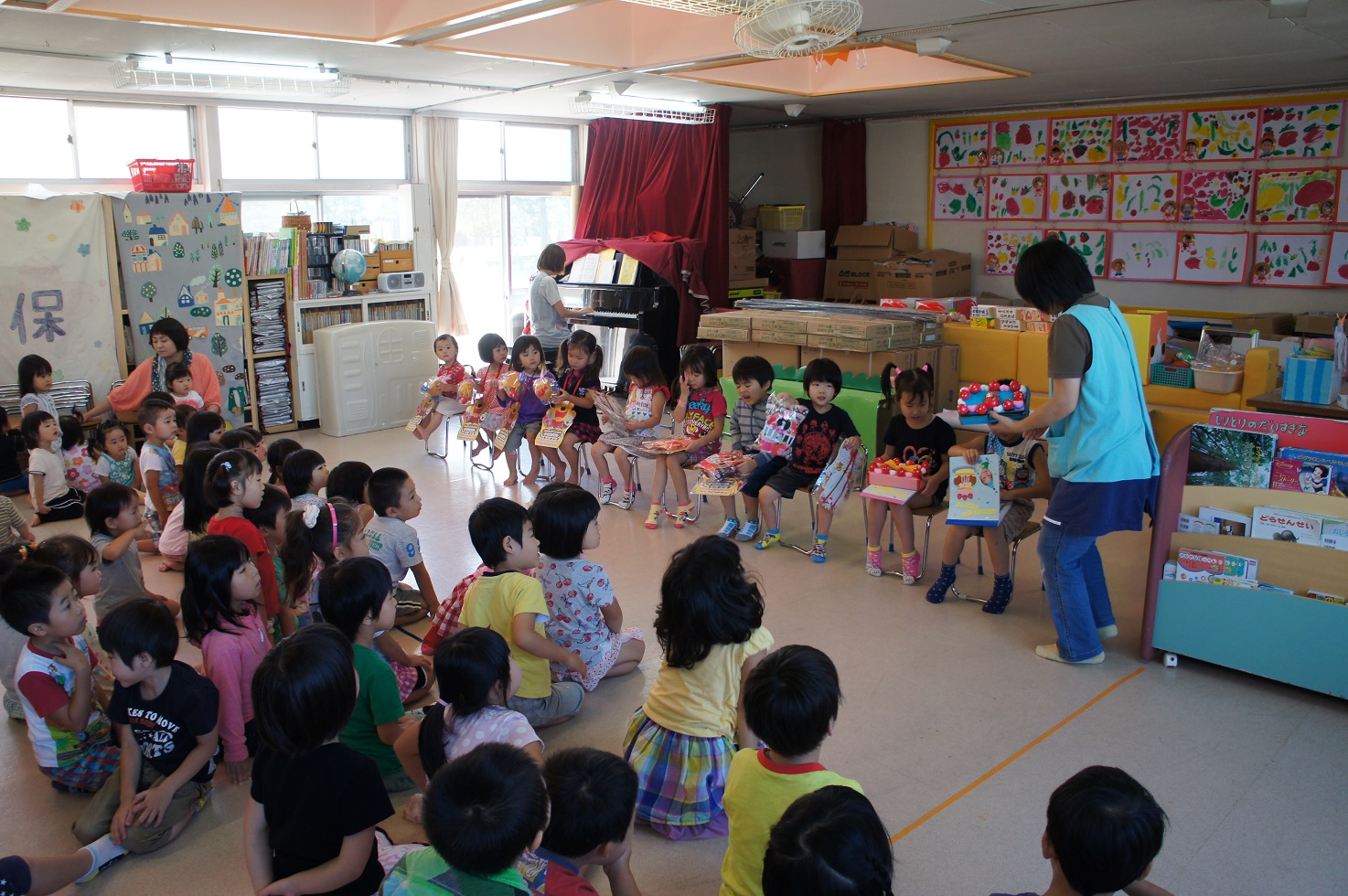 楽しい雰囲気の中で始まった誕生会。元気よく朝の会をしました。少しドキドキした様子も見られましたが、一生懸命インタビューに答えたり、プレゼントをもらい嬉しそうな表情をしていた子ども達でしたよ。