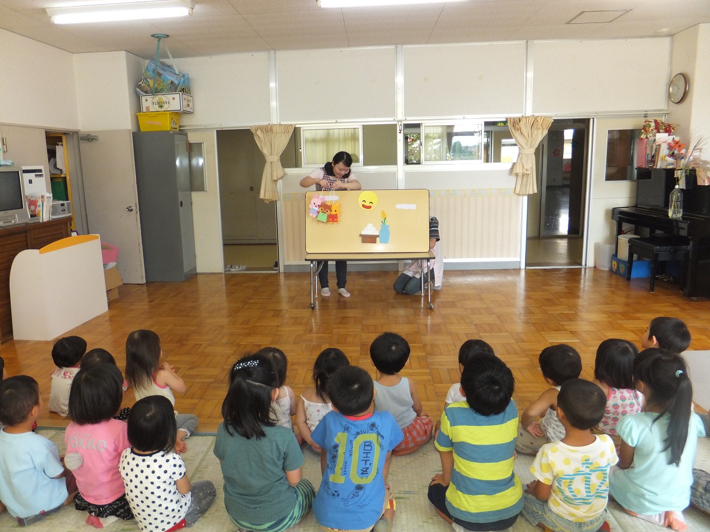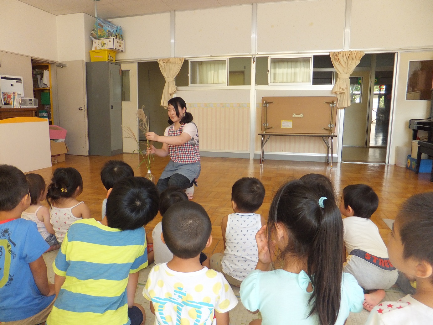 十五夜の由来を聞いたり、すすきを見たり、興味津々な様子が見られました。 おたのしみのペープサートも楽しんでいましたよ。