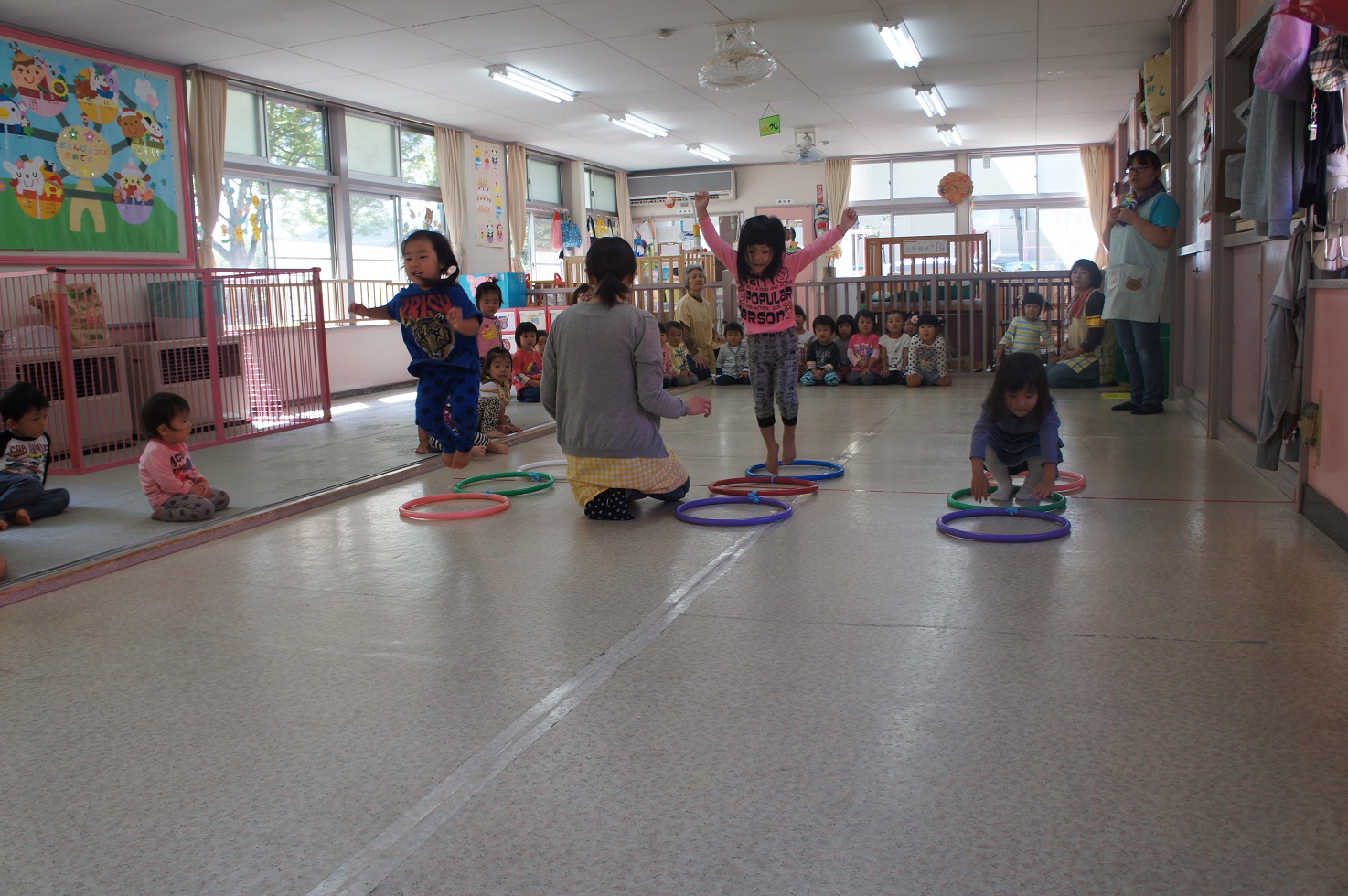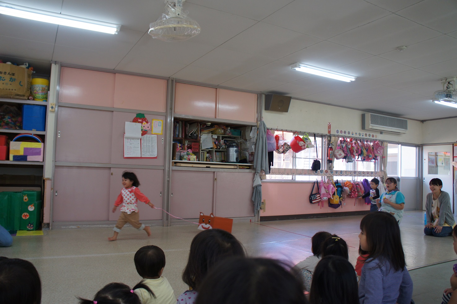 天気があまりすぐれず、本園の保育室で行いました。 おはようのうたや体操をした後、1、2歳児に分かれ動物の車を引っ張る競争をしました。