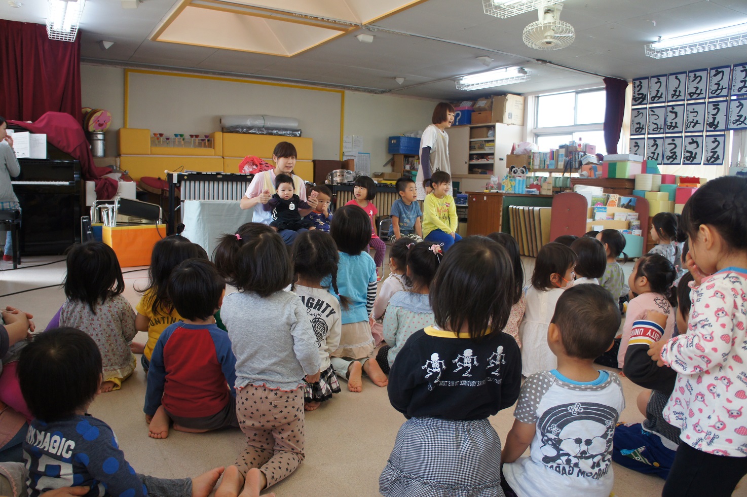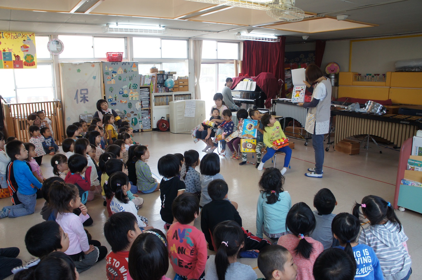 誕生児は元気にインタビューに答えたり、プレゼントをもらい嬉しそうな表情が見られていました。 おたのしみの紙コップシアター「秋の楽しい遠足」では、曲に合わせてバスに乗ってを歌い、全クラスで楽しんでいました。