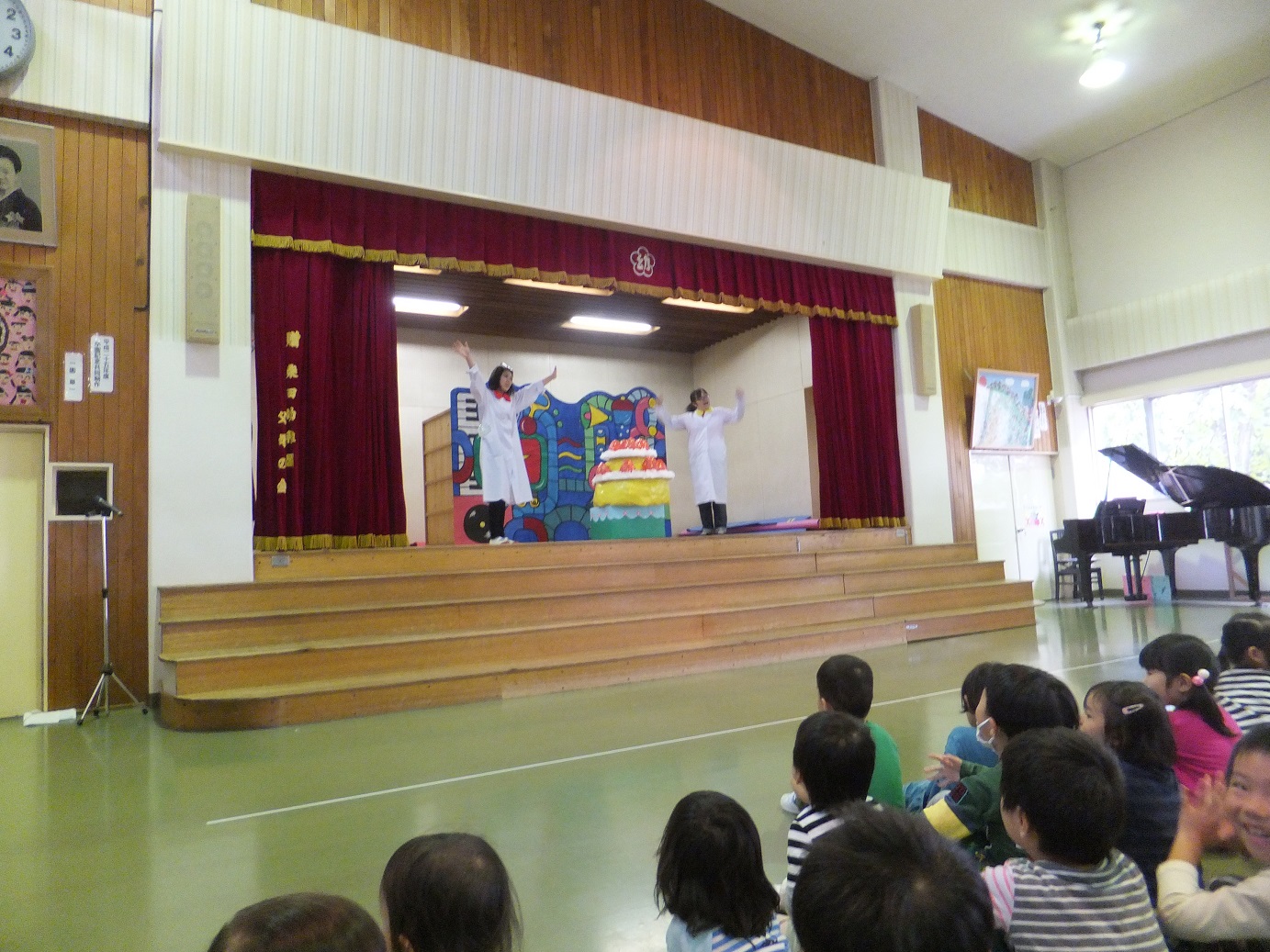 9月生まれの誕生会に参加しました。 誕生日のお友達は緊張していた様子でしたが、笑顔で登壇していましたよ。 おたのしみの「スキップ博士の大発明」は集中して見ていました。