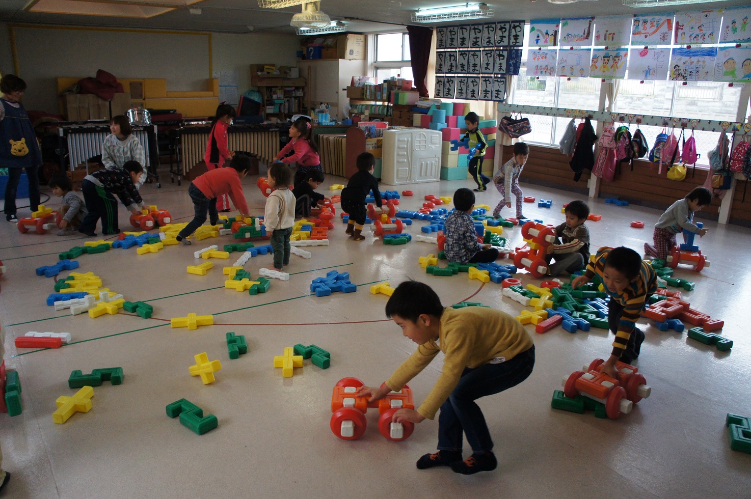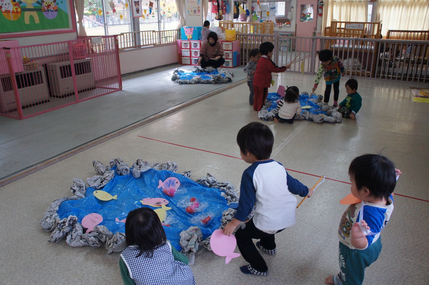 今回の自由保育は、大型ブロック、ハロウィンのカバン製作コーナー、おかしの製作コーナー釣り堀コーナーの4つのコーナーを設けて行いました。ハロウィンのカバンを嬉しそうに抱えたり、大型ブロックでのびのびと遊んでいました。