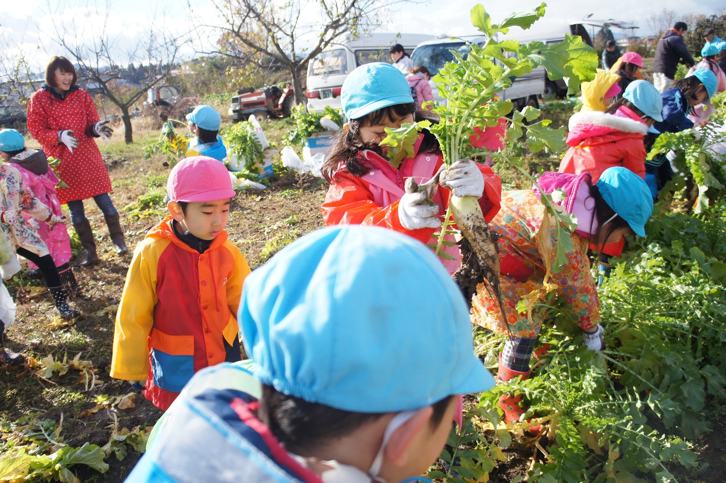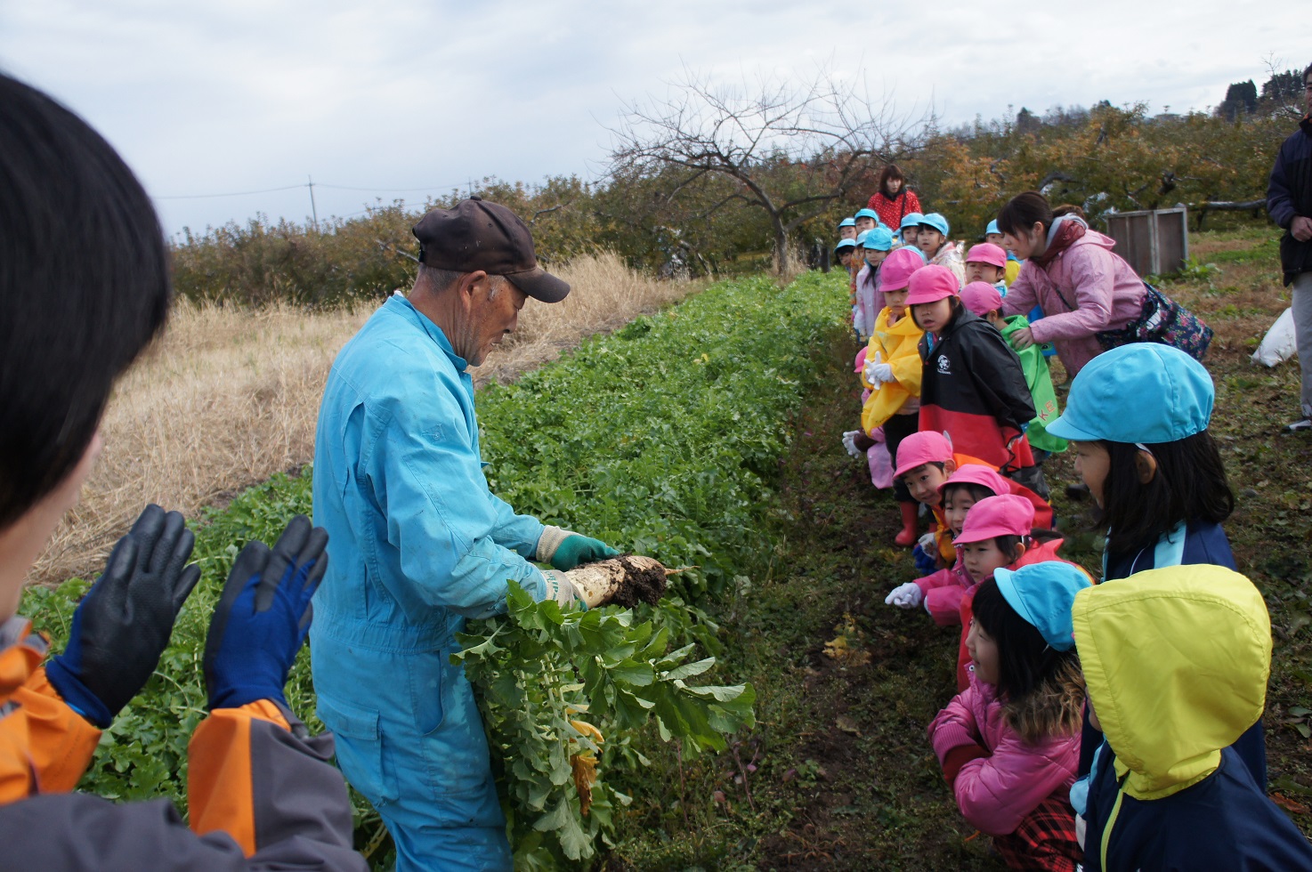 岩木川近くの畑へ行き、さくら組・すみれ組が大根掘りをしてきました。