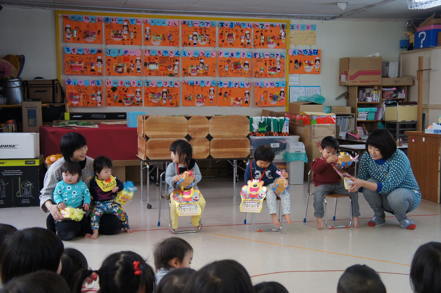 ちゅうりっぷ・つくし組合わせて5名のお友達でしたが、自分の名前を元気に言ったり手を挙げてお返事をしたりと、とてもかわいらしい姿が見られました。