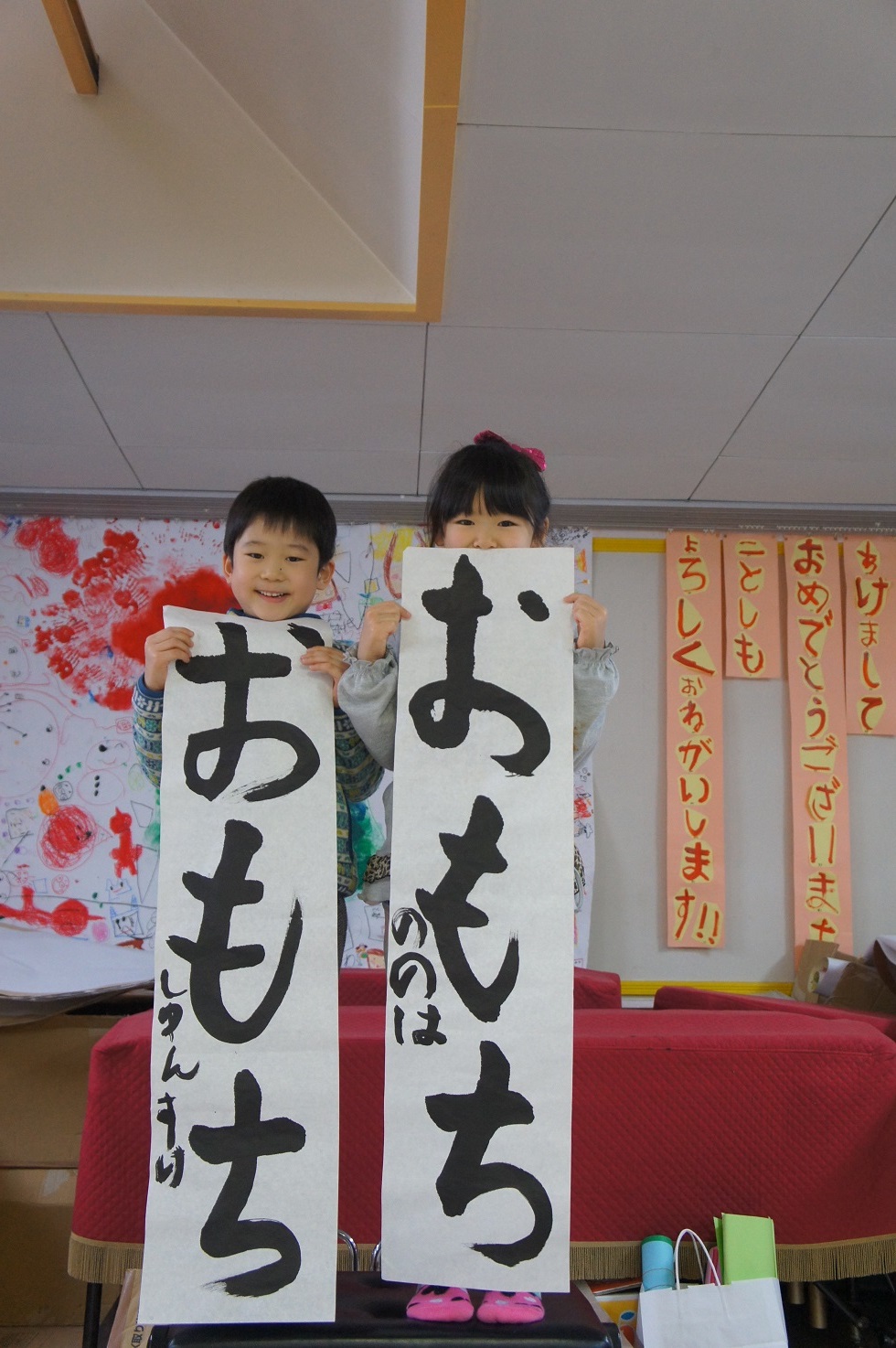 書道教室で書き初めをしました。 初めての長い半紙、大きな筆に驚きながらもしっかりと話を聞き堂々とした「おもち」の字を書いていましたよ。 自分や友達の作品を見て褒め合う姿が見られていました。