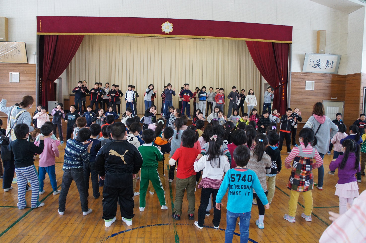 体育館へ移動し、一年生と一緒にピアノの音に合わせて歩く、走る、ジャンプするなどのリトミックをしたり、四年生とようかい体操第一やゲラゲラポーのうたを歌い楽しみました。
