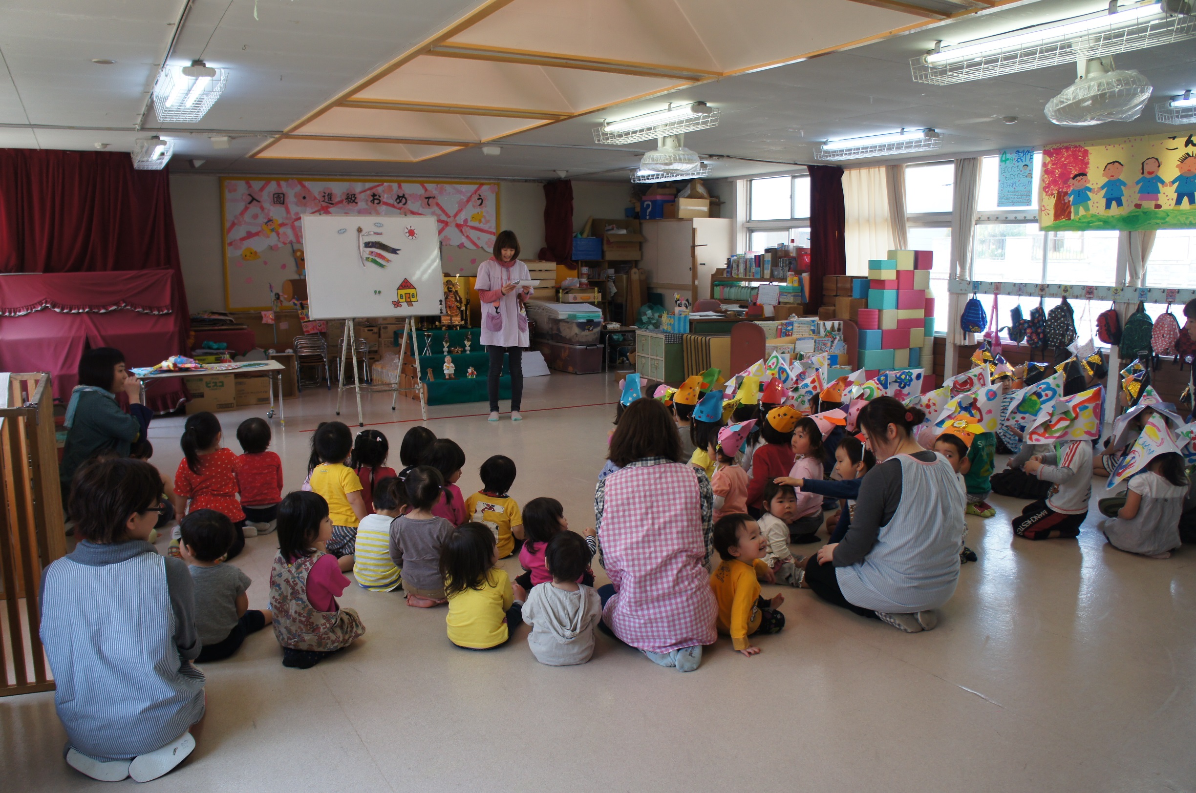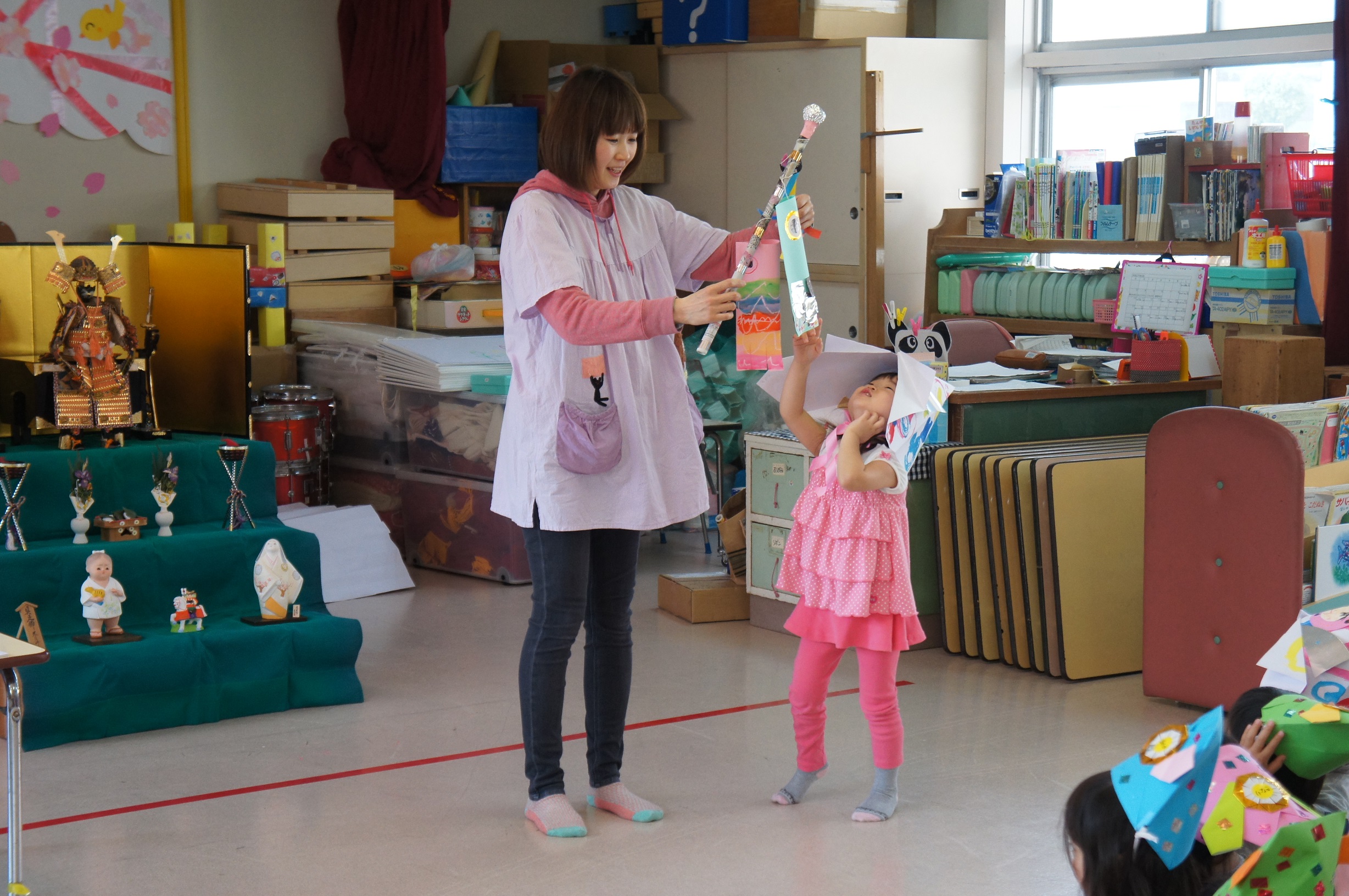 各クラス、自分達で作った兜を被って集いました。楽しい雰囲気の中、端午の節句の由来を聞いたり、「こいのぼり」の歌を元気一杯歌ったりして、和やかに行われました。お楽しみでは、ペットボトルシアターを集中して見ており、時折「頑張れ!頑張れ!」と声援を送っていましたよ。