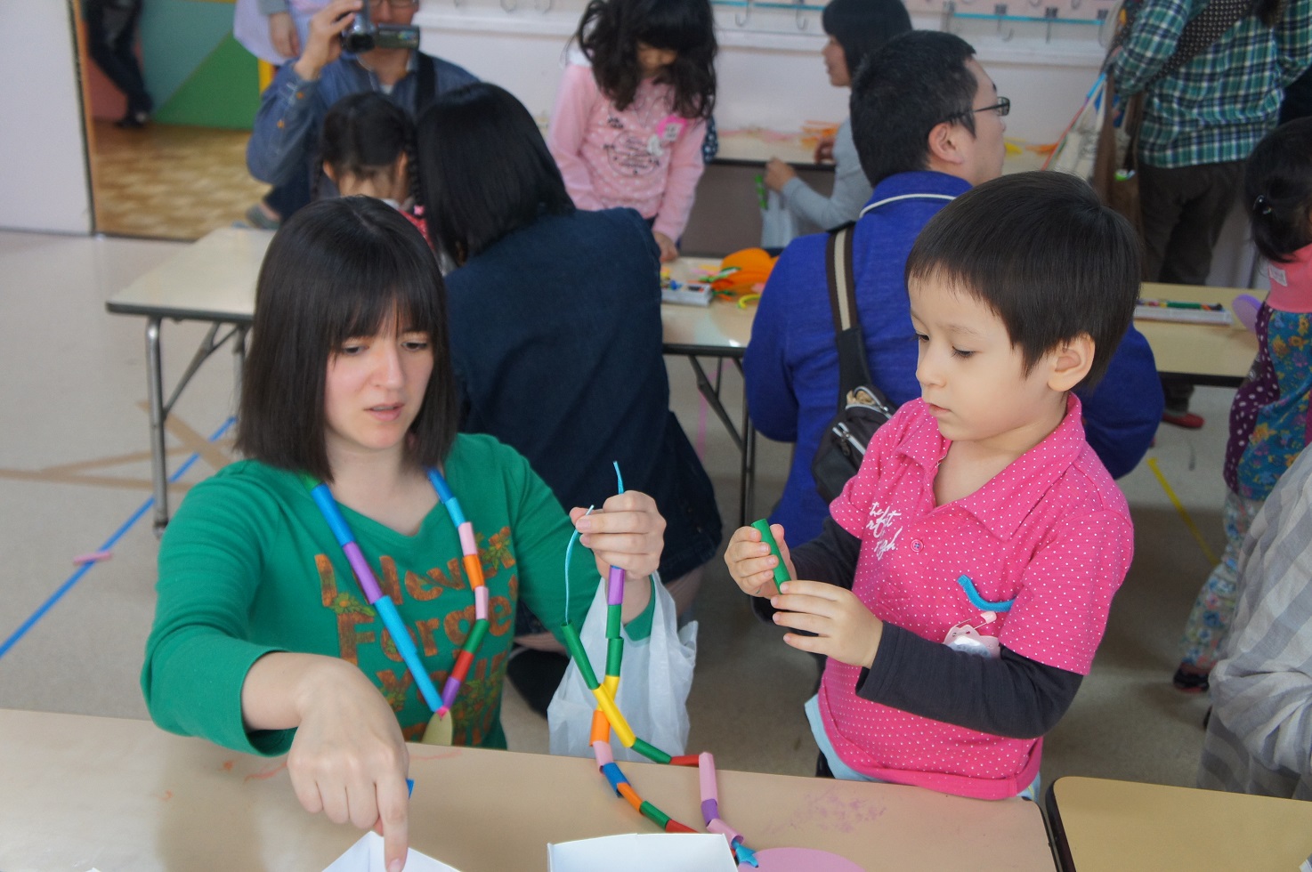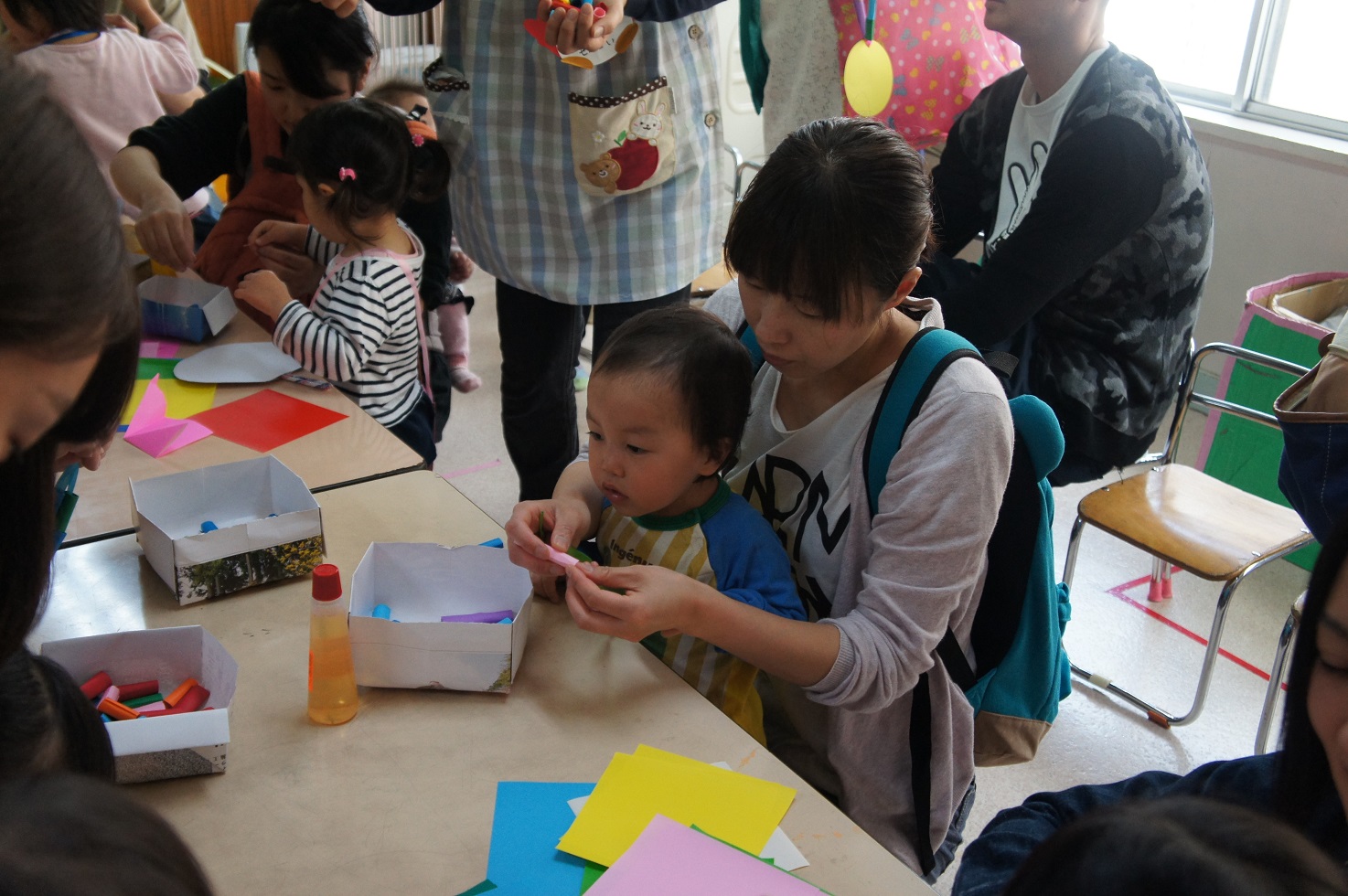 「ぱたぱたちょうちょ&ネックレスコーナー」「カラーメガネ&ロケット&牛乳パック手裏剣コーナー」「くるくるこいのぼり&こいのぼりかばんコーナー」「迷路コーナー」の4つのコーナーを設けて製作を楽しみました。