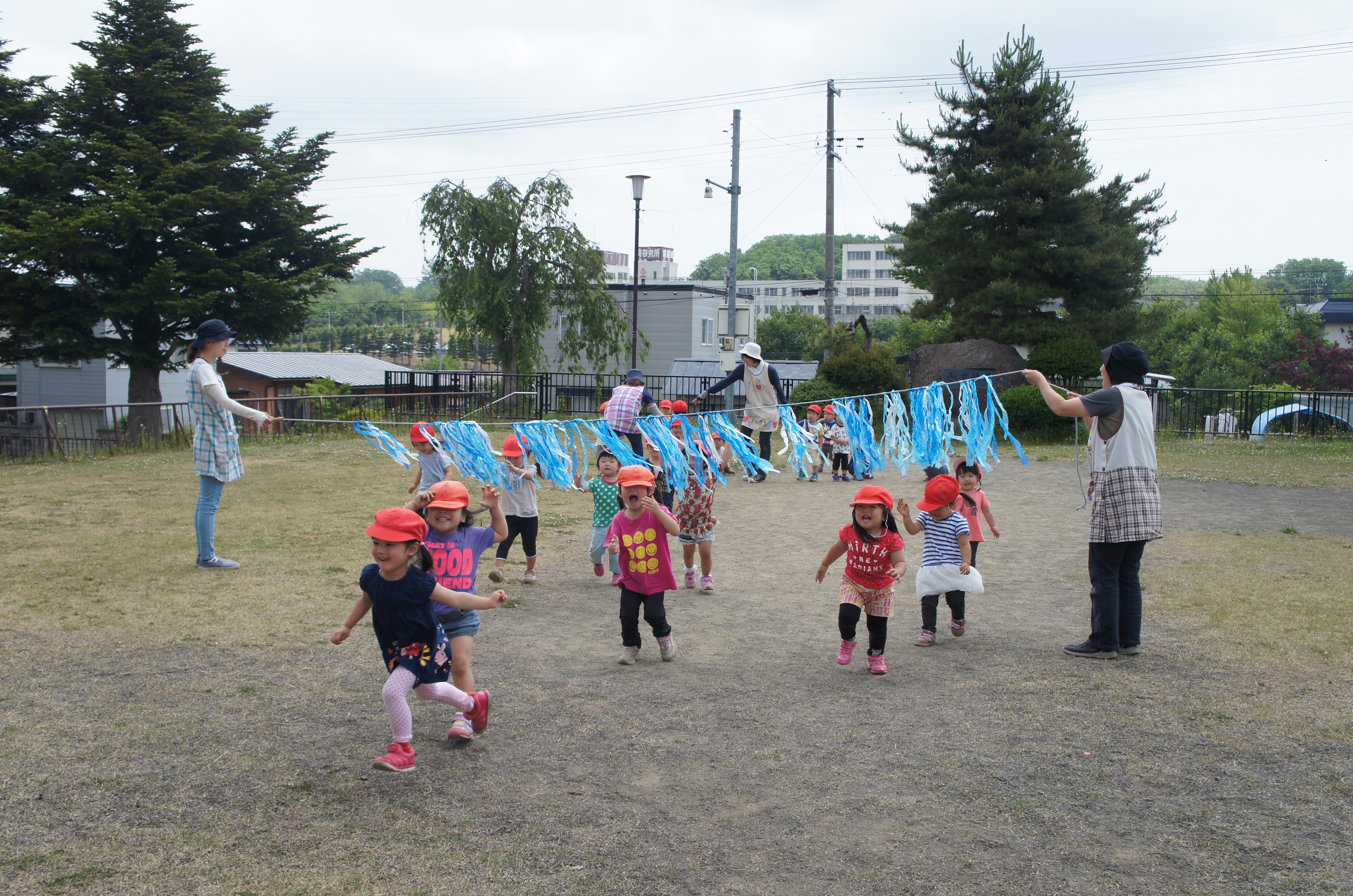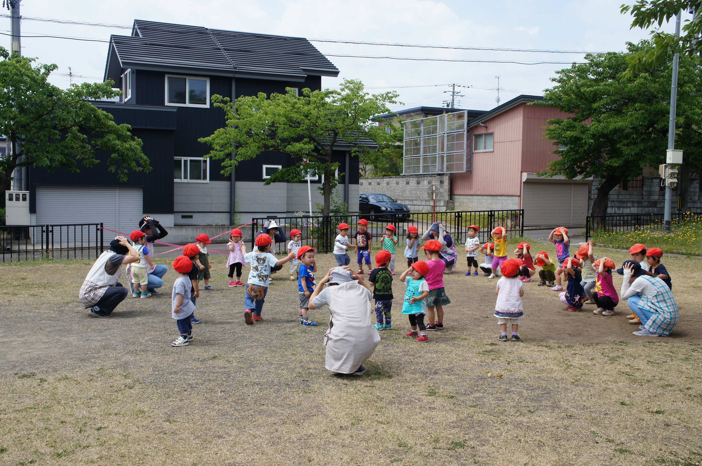 良いお天気に恵まれ、中央公園でのびのびと運動遊びを楽しんだ1、2歳の子ども達。「しゅりけんにんじゃ」のお遊戯を楽しんだ後、忍者になりきって川に見立てたすずらんテープのロープをジャンプしたりくぐってみたりと、とても上手にできていました。その後は自由に公園を駆け回り、しゃぼん玉を追いかけたり、草花を摘んだりして思い思いに楽しんでいました。