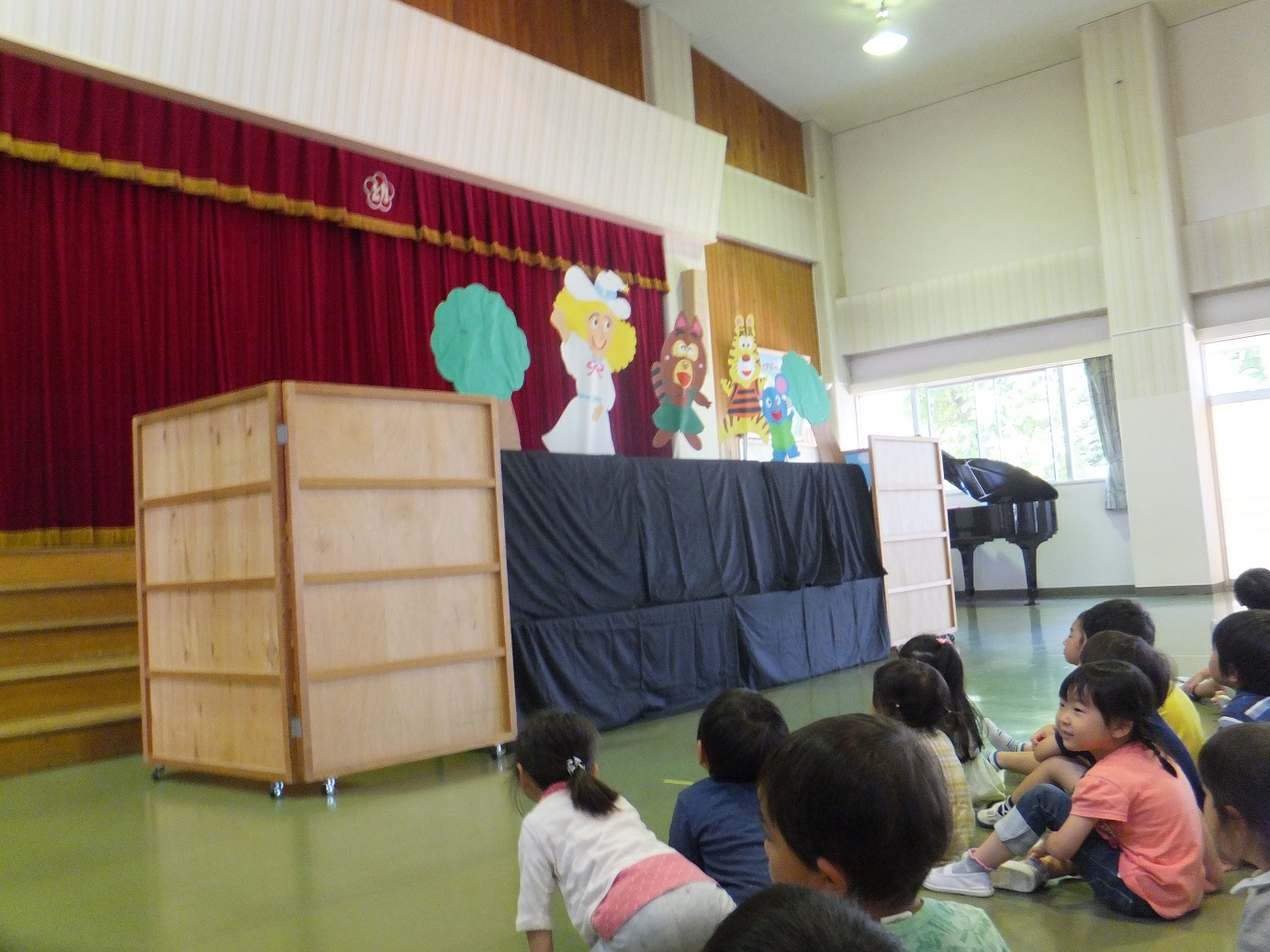 お楽しみの大型ペープサート「あらいぐまとまほうつかいのせんたくや」は、何の動物かを元気に答えたり、魔女の登場に驚いたりしながら楽しんでいましたよ。