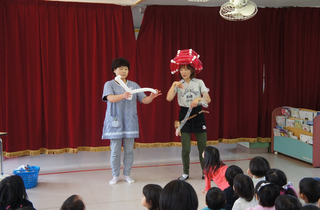 すみれ組の部屋でバルーンアートを行いました。ボランティアの方にお越しいただき、風船を膨らませ「剣」や「草花」を作っていました。子どもたちは何ができるのだろう・・・と想像しながら真剣に見ていましたよ。作品が出来上がると歓声が上がりとても喜び、子ども達の目がキラキラしていました。