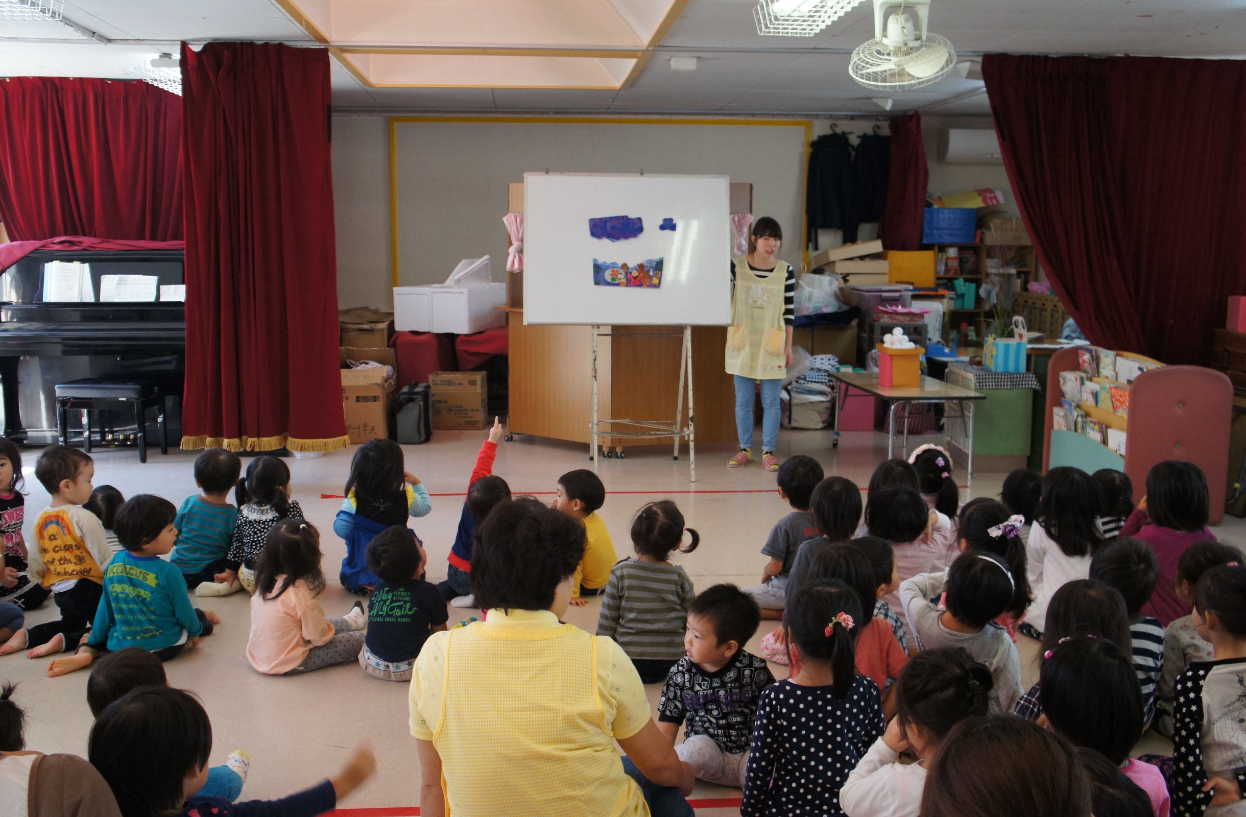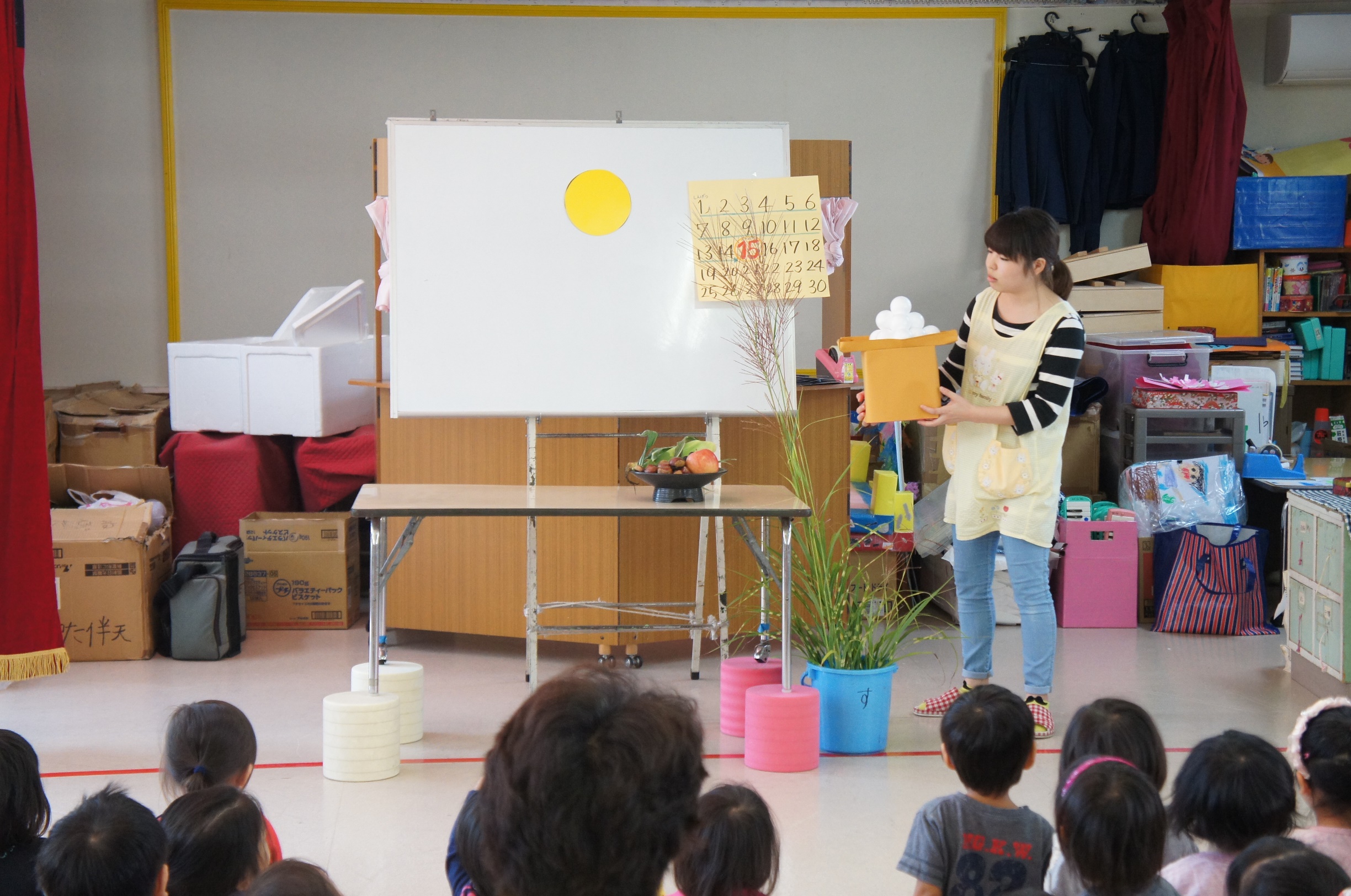 すみれ組の部屋で十五夜集会がありました。十五夜にお供えするものを実際に見たり、十五夜の由来についてのお話を聞いたりと子ども達は興味深そうに参加していましたよ。お楽しみの十五夜クイズでは、「分かる人ー?」の問いかけに元気よく手を挙げていました。