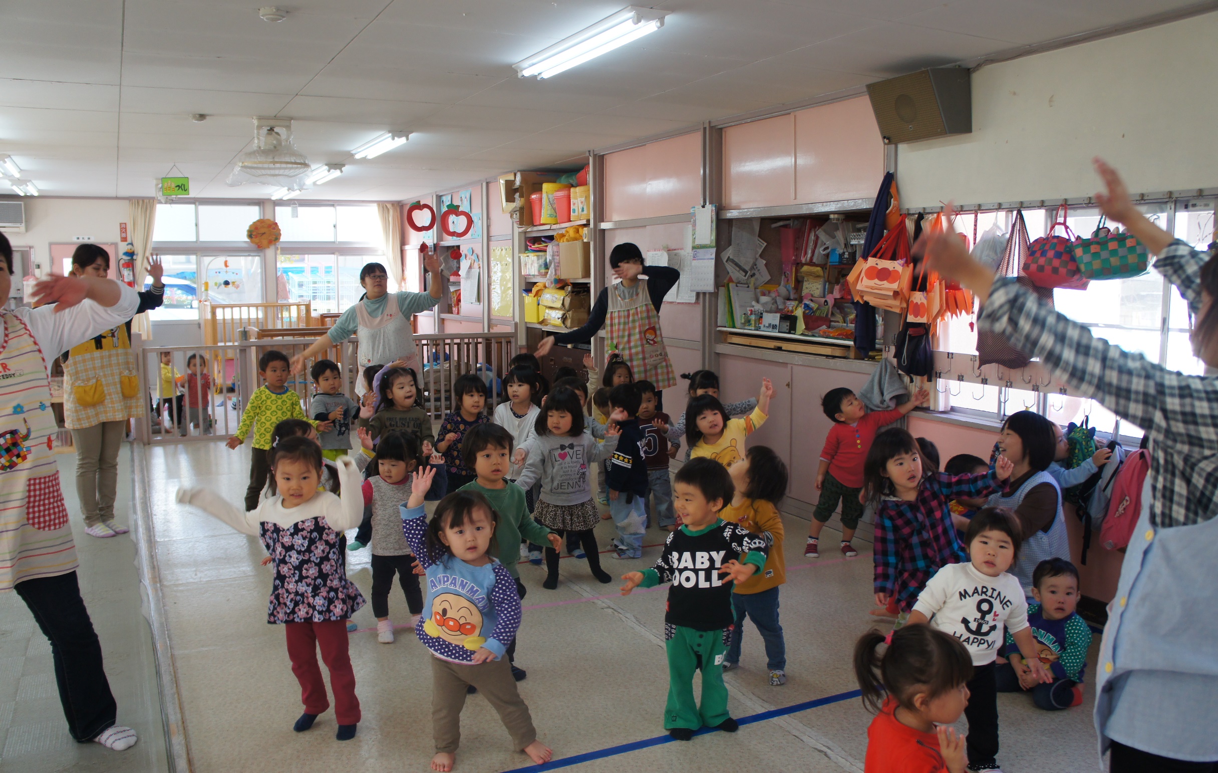 本園ちゅうりっぷ組の部屋で1、2歳児の運動遊びがありました。「ドンスカパンおうえんだん」の遊戯を楽しんだ後、風船を使ったゲームをし、ジャンプして風船を触ったり、風船でリレーをしたりと興味津々の様子で遊んでいましたよ。本園、分園の交流を深める良い機会になりました。