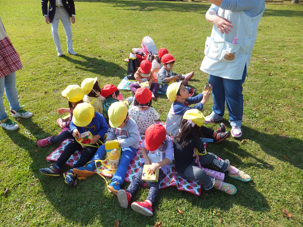 ちゅうりっぷ組さん、たんぽぽ組さんは、自分で作ったかばんにおやつを入れ、元気に三岳公園まで歩いていましたよ。到着してからみんなで仲良くおやつを食べ、公園の遊具でたくさん遊び、大満足の様子でした。