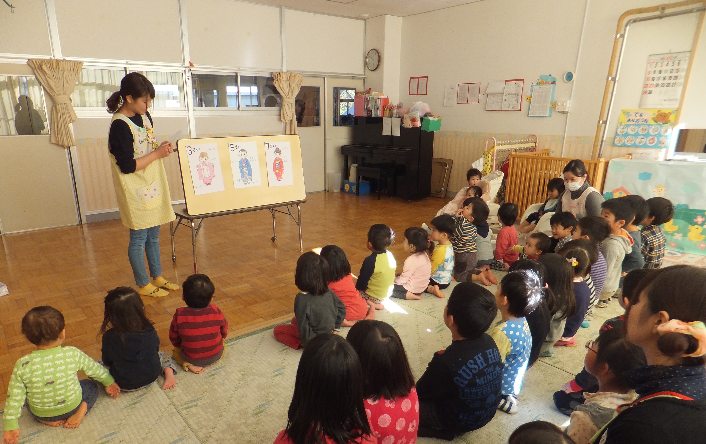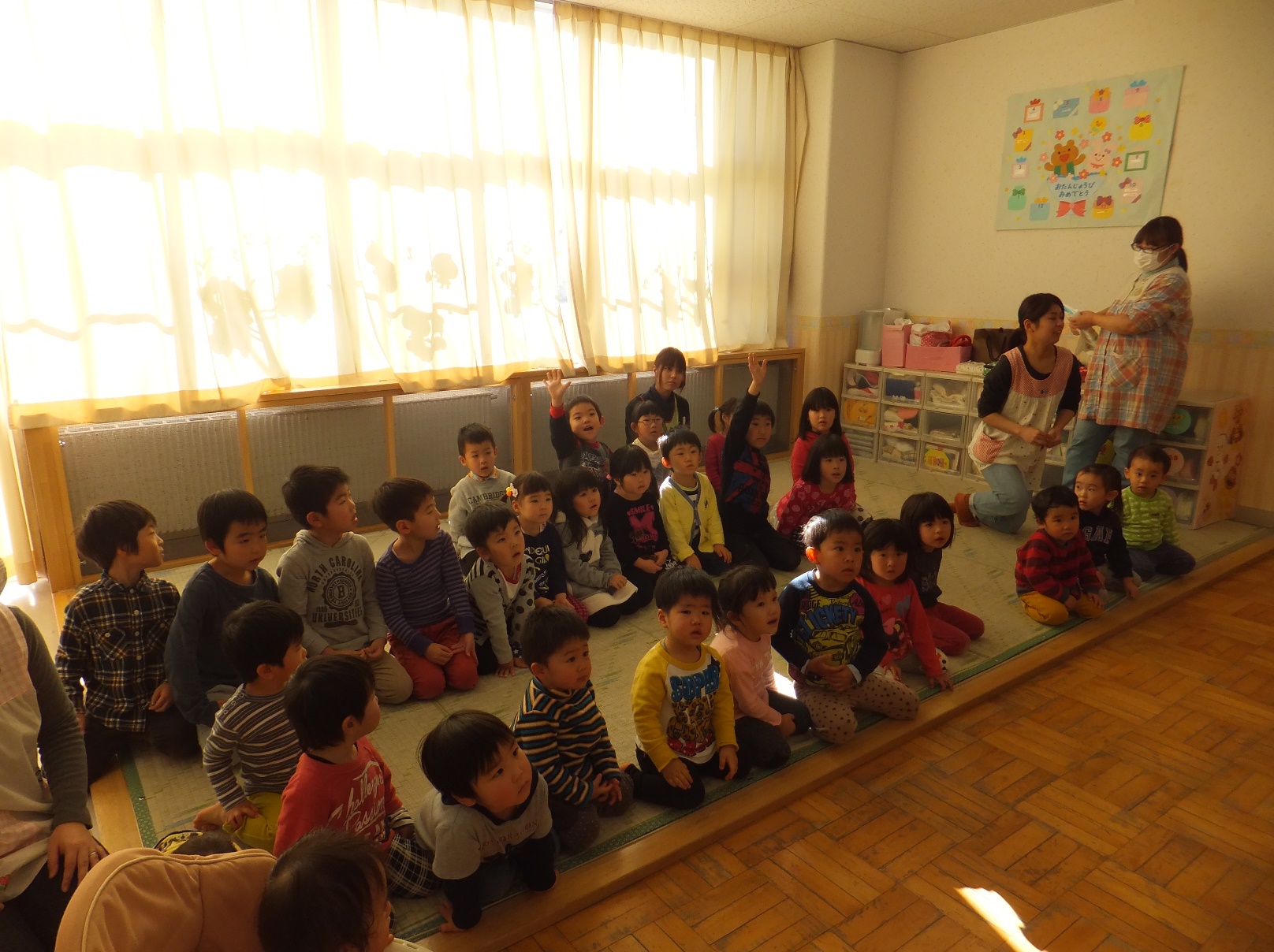 七五三集会では、七五三の由来やどんなものを着るのかのお話があり、興味津々で聞いていましたよ。ペープサートシアターでは、お話の世界に入り込んで見ていましたよ。千歳飴のにおいを嗅いでみるお友達もいましたよ。