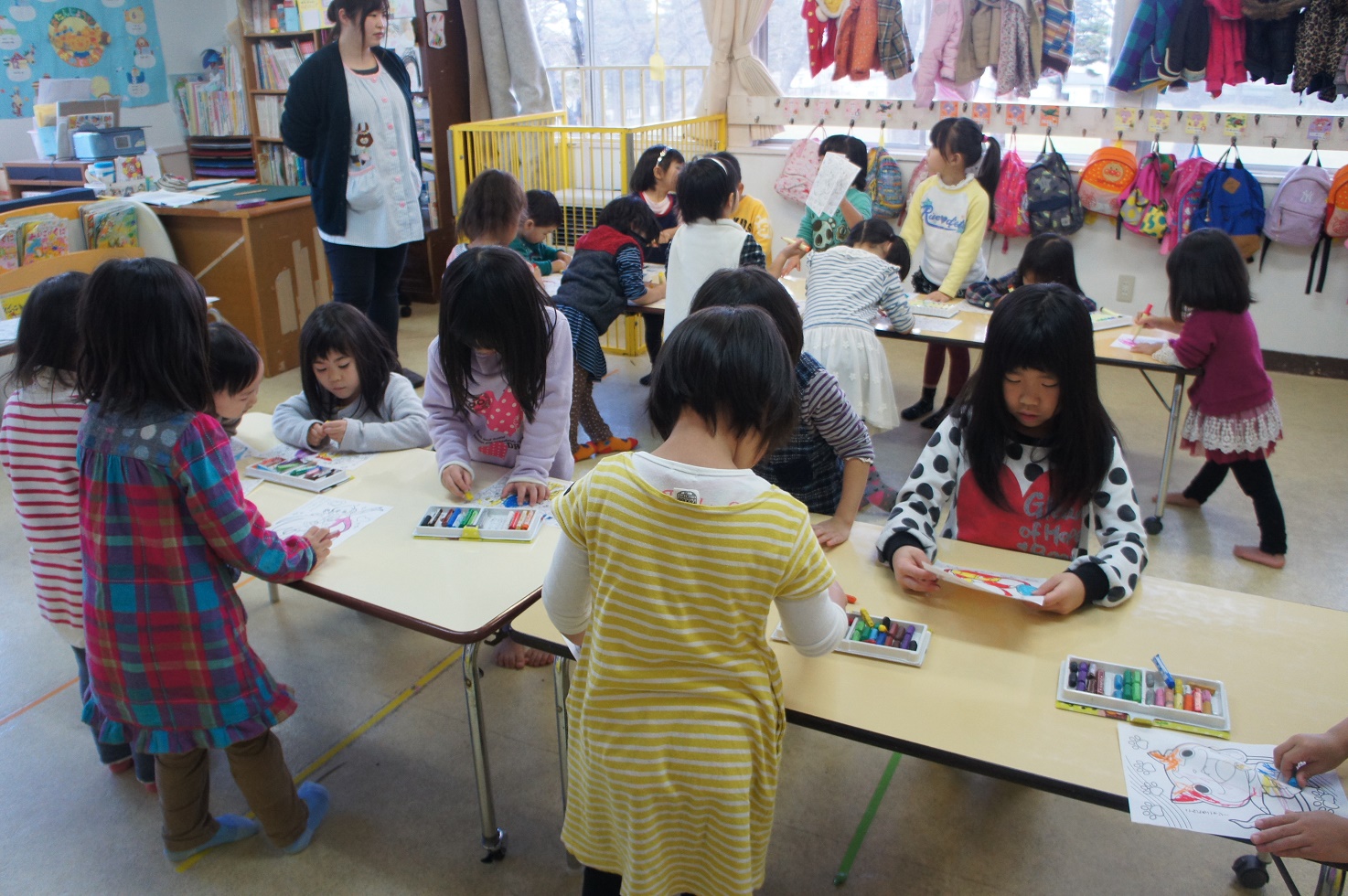 ままごとコーナー、チラシ遊びコーナー、塗り絵コーナー、カスタネット製作コーナーの4つのコーナーで遊びました。