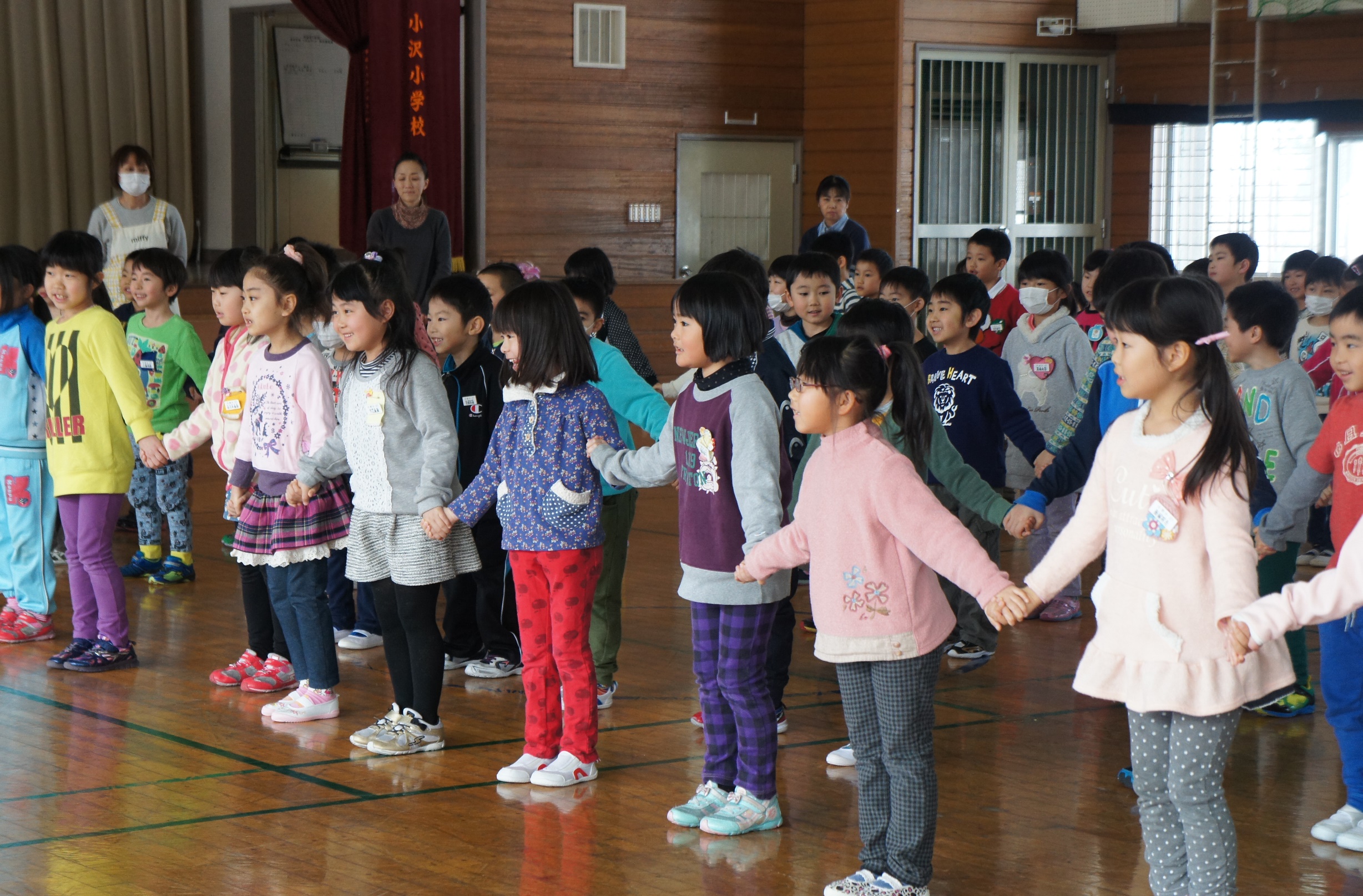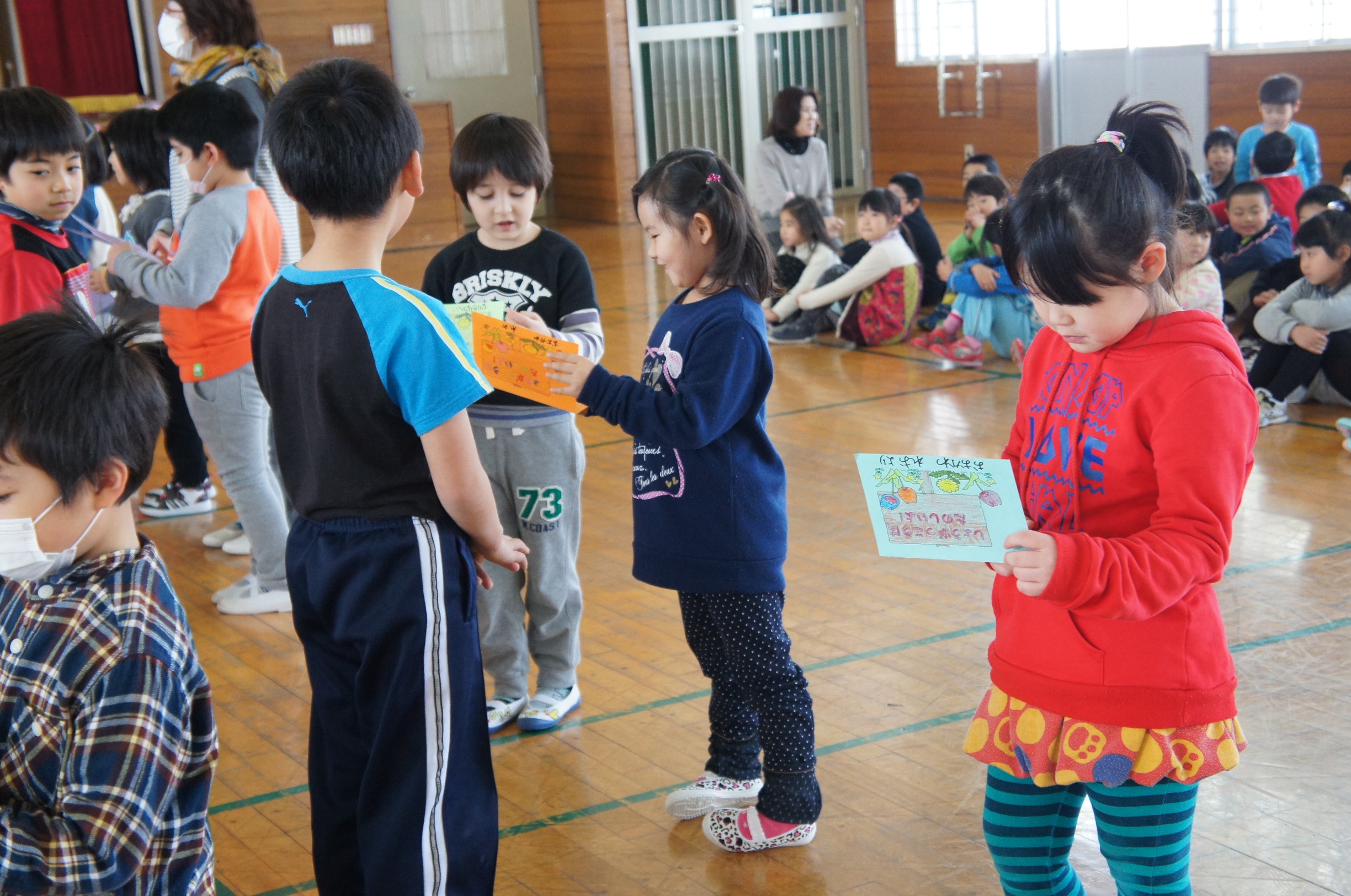 小沢小学校へ小学校見学に行きました。学校内や授業中の様子を見学したあと、体育館で1年生、2年生と交流をしました。簡単なゲームをしたり校歌を聴き、最後には手作りカードのプレゼントをもらいとても楽しい時間を過ごしました。みんな、小学校がますます楽しみになり早く行きたい!と話していました。