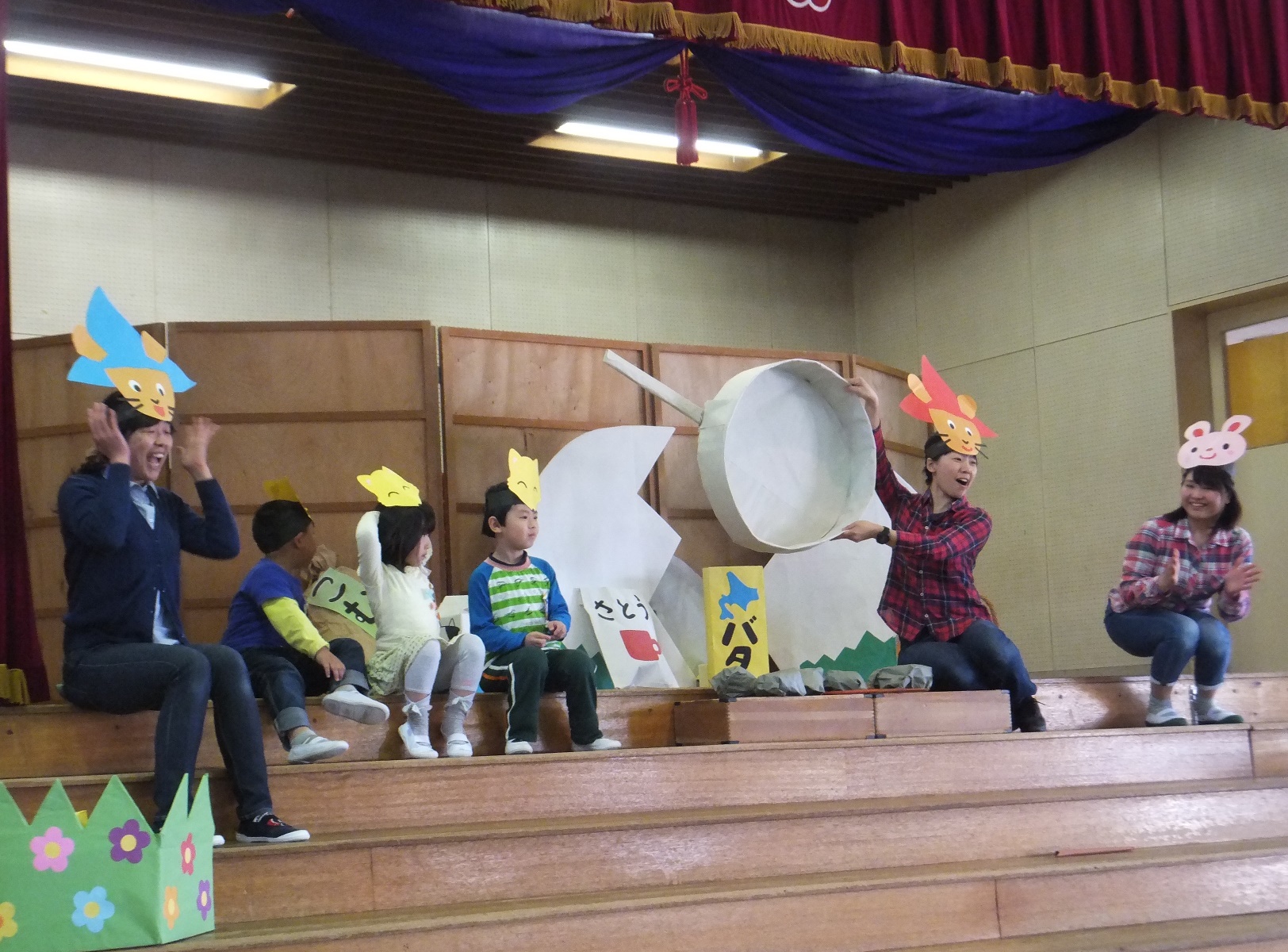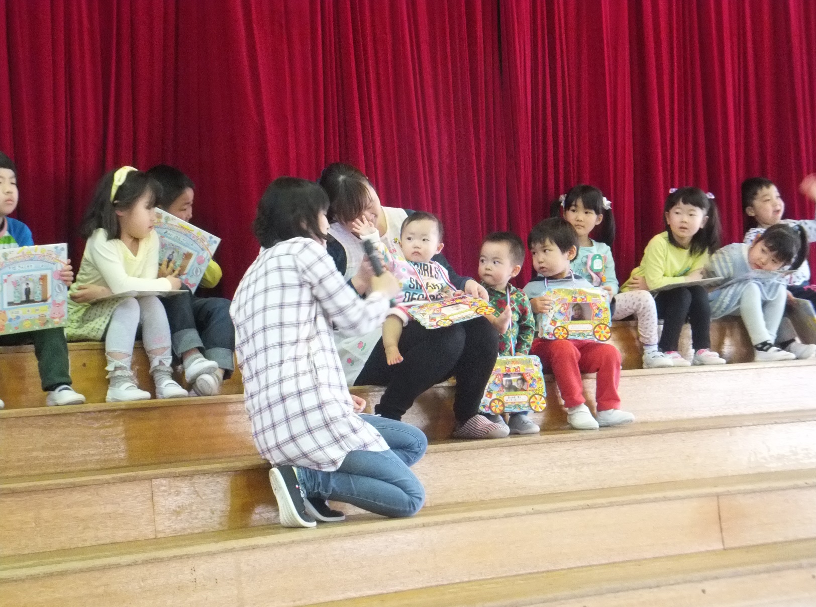 3人の4月生まれのお友達がドキドキしながら入場していました。インタビューは、しっかり前を向いてお返事やお名前を言うことができましたよ。お楽しみの劇「ぐりとぐら」は、卵やカステラの大きさに驚きながら、「おいしそ~」と目を輝かせながら見ていました。