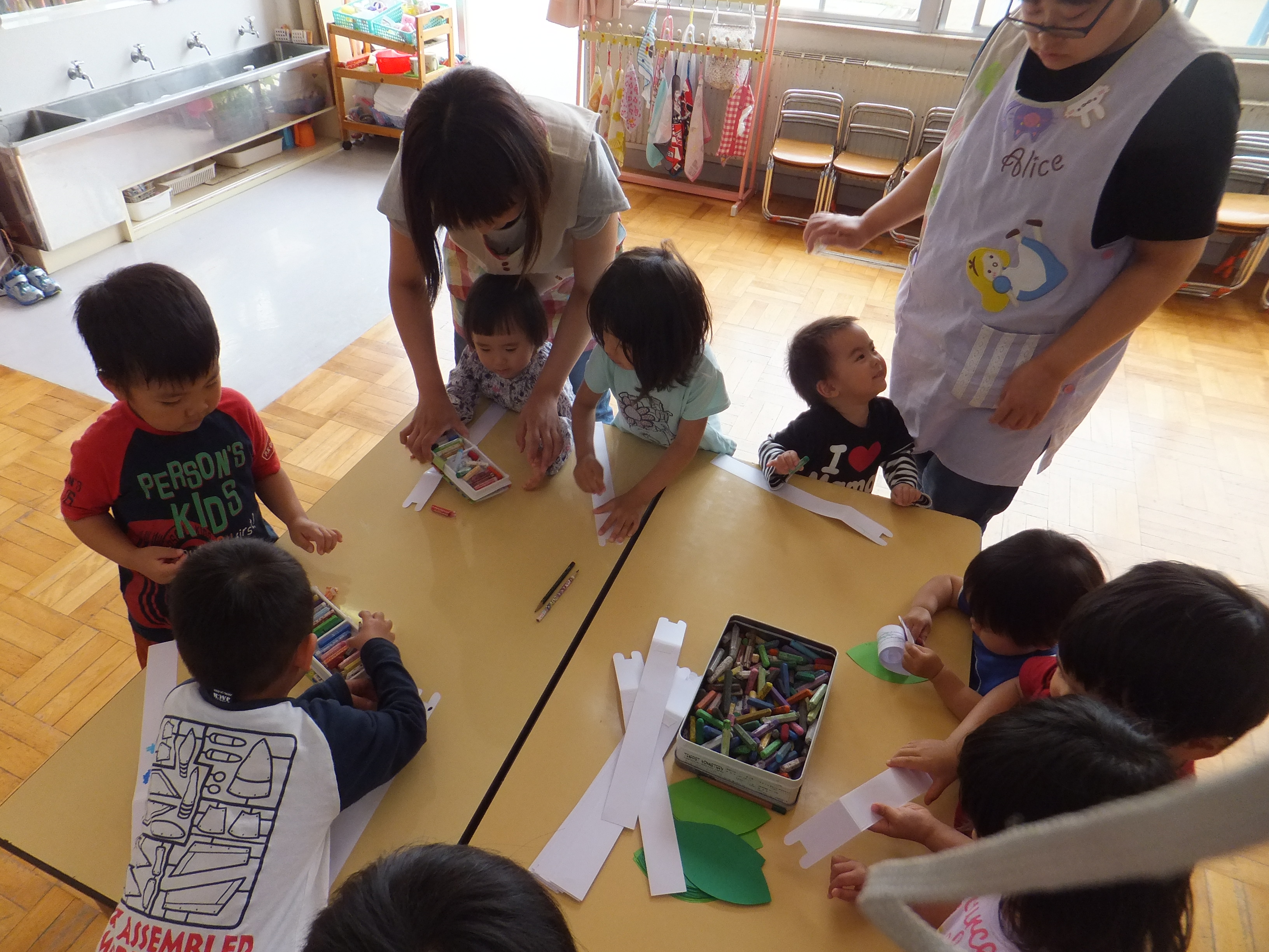 ちゅうりっぷ組保育室はのりものコーナー、すみれ組保育室は製作コーナーでかたつむりを作って遊びました。