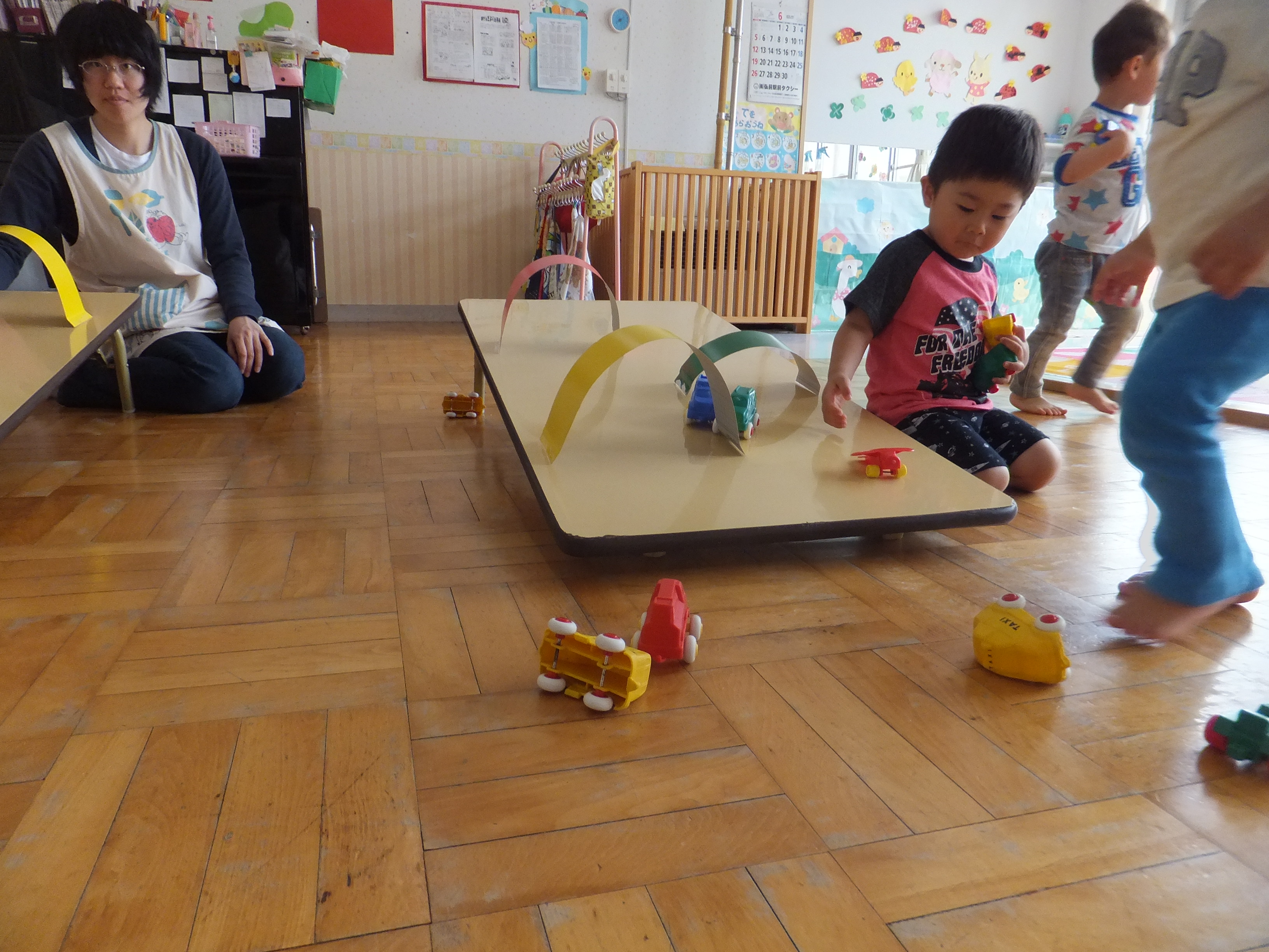 のりものコーナーでは、ミニカーをトンネルにくぐらせるように走らせたりと楽しんでいましたよ。
