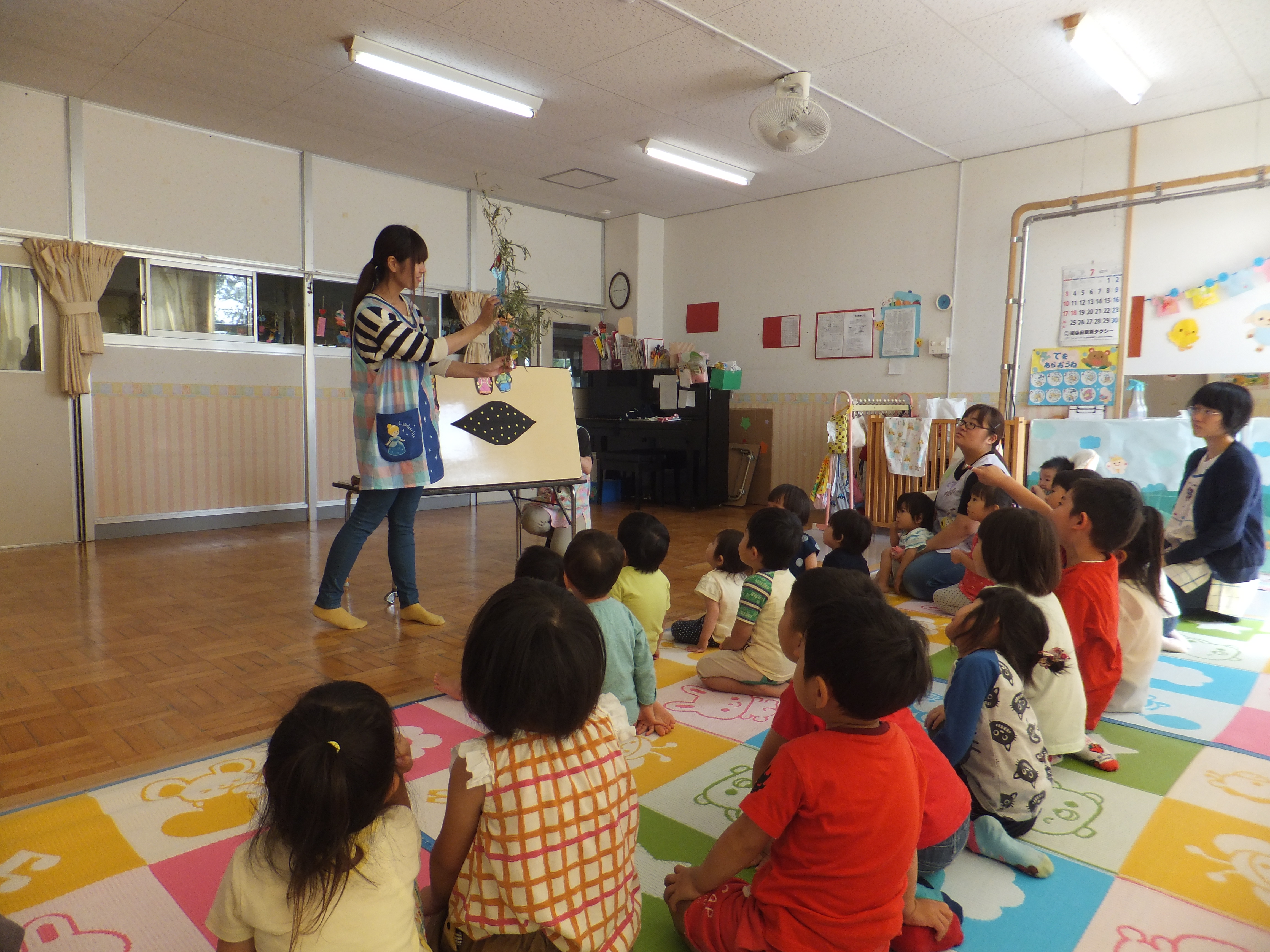 七夕の由来のペープサートを集中して見ていました。自分たちが作った笹飾りが紹介されると嬉しそうにしていましたよ。