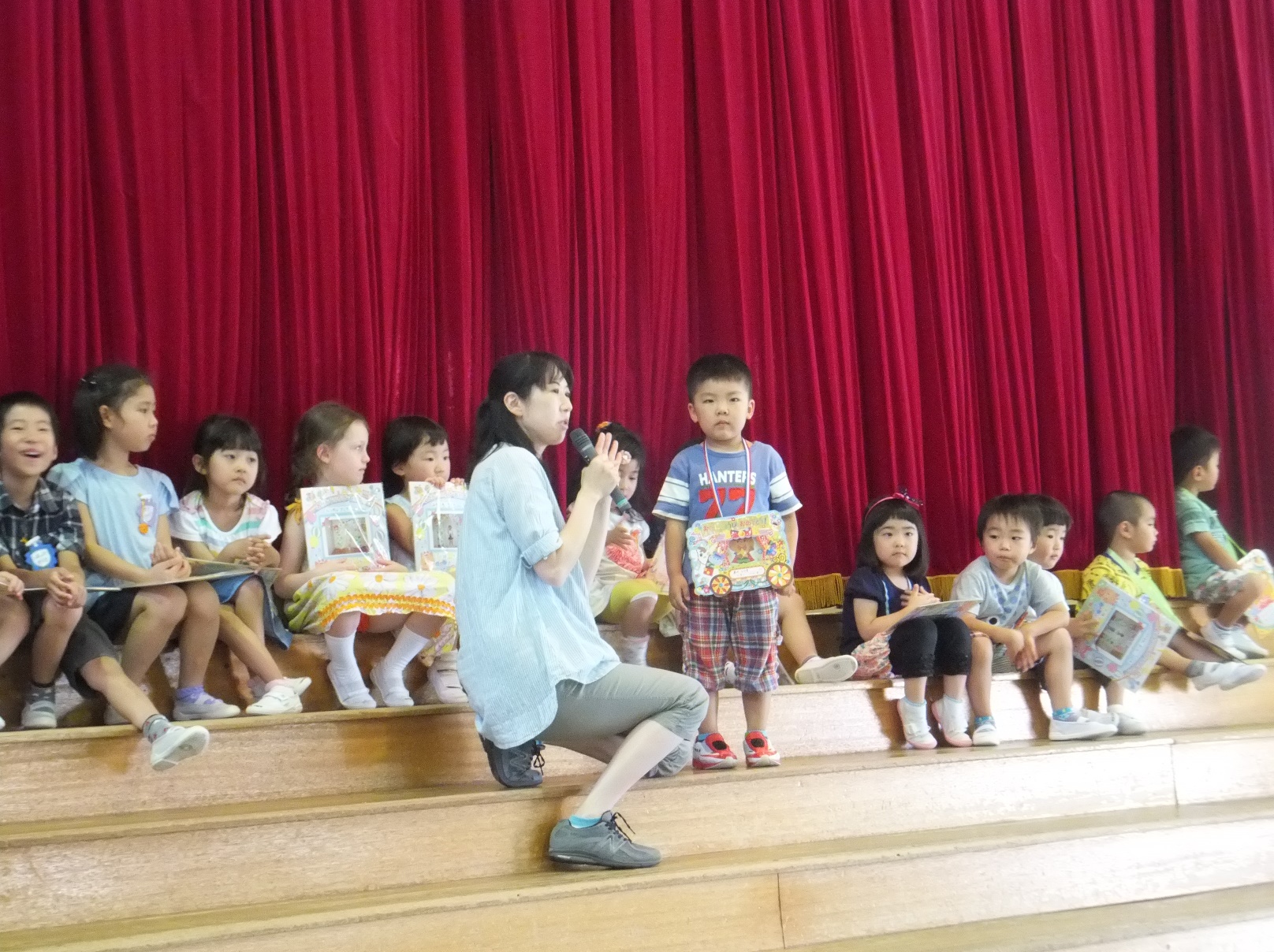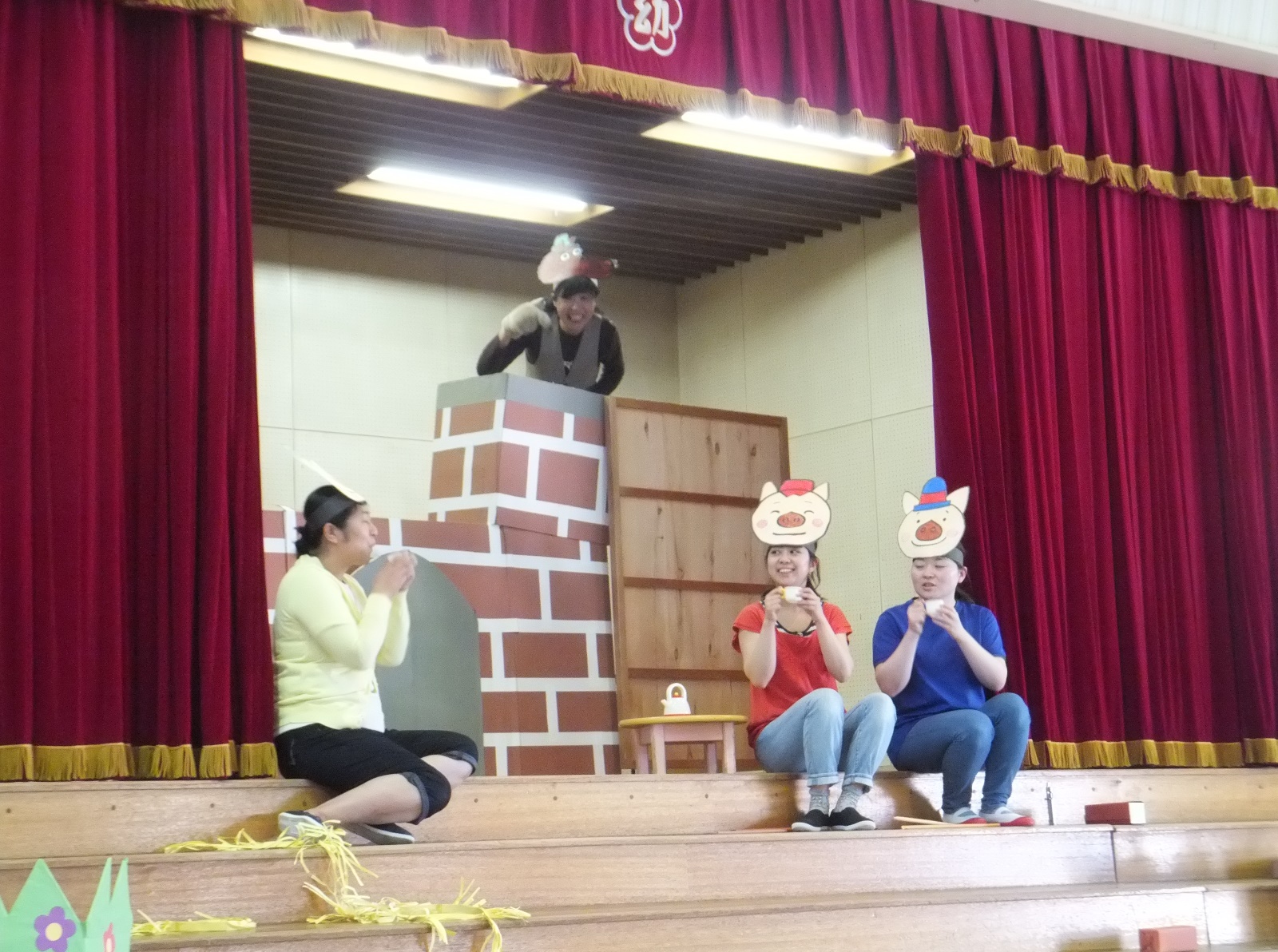7月生まれのお友達が緊張しながら入場していました。インタビューは、とっても上手に答えることができていましたよ。お楽しみの「三匹のこぶた」の劇では、保育園の先生を見つけて喜んだり、オオカミに驚いたりしながら楽しそうに見ていましたよ。