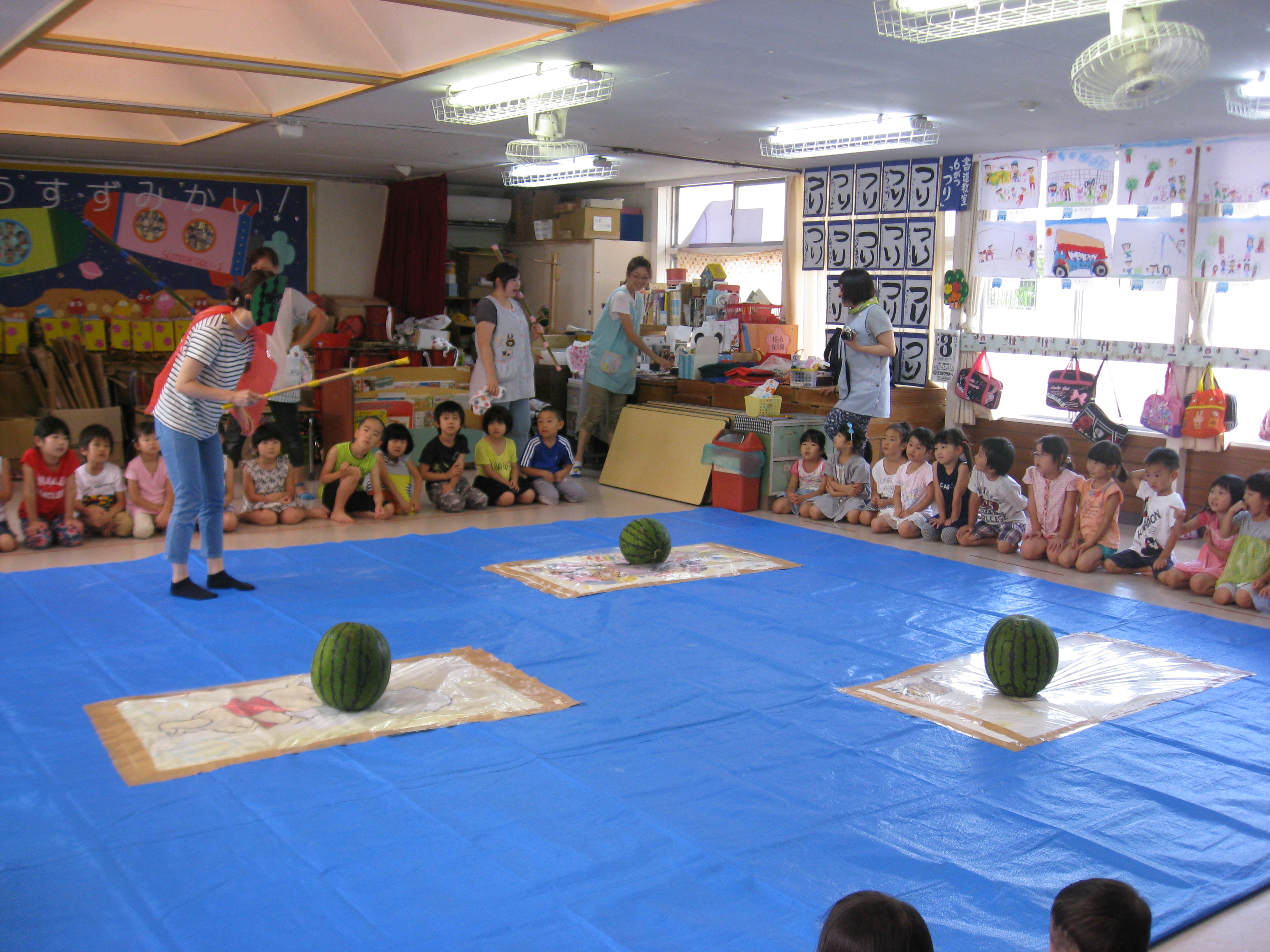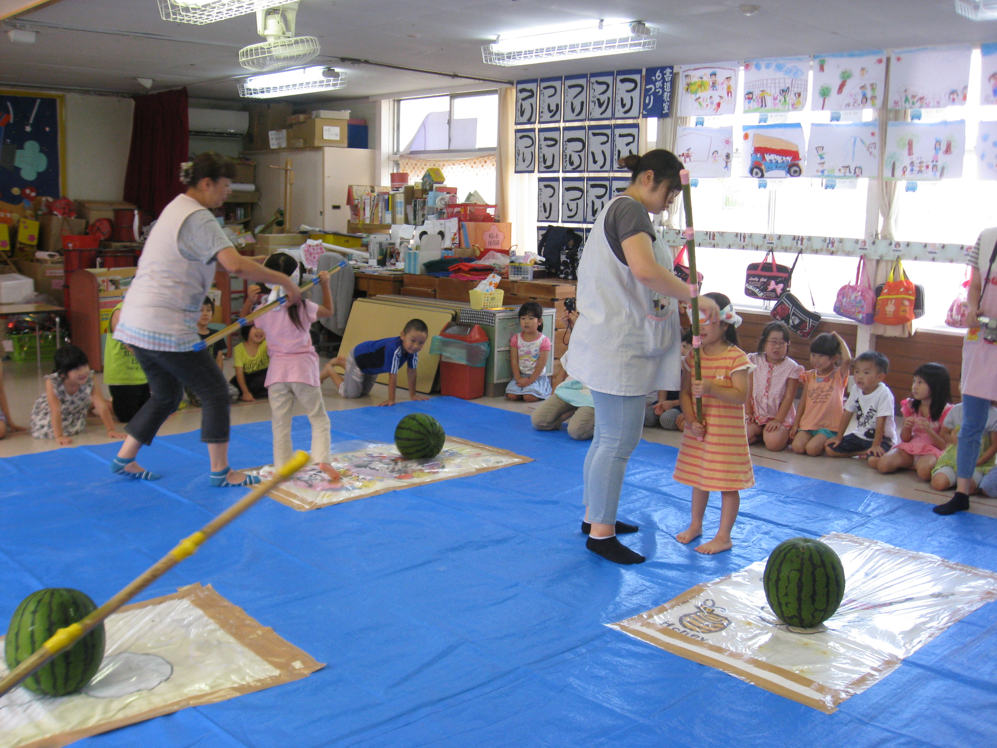 すみれ、さくら、たんぽぽ組のお友達は自分で棒を持ち力一杯すいかを割っていました。