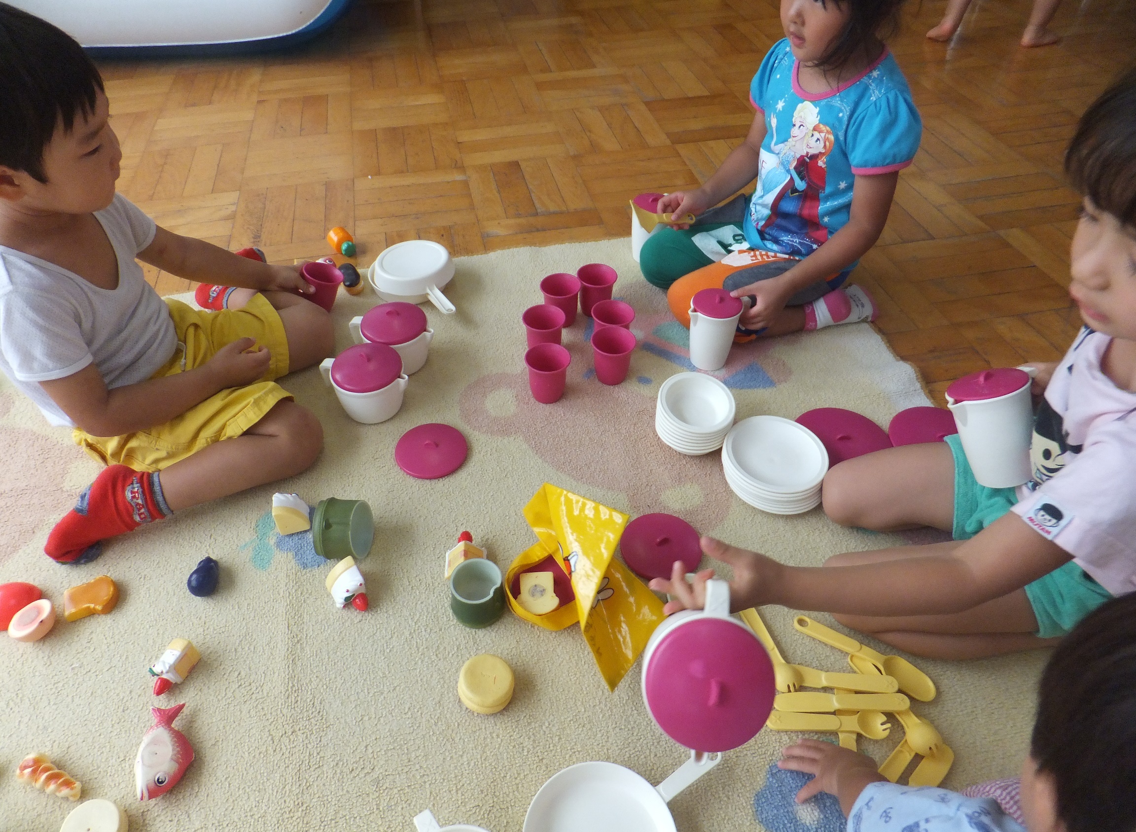 ぶどう製作コーナーとままごと、木製トレインコーナーで遊びました。製作コーナーでは、上手にお花紙を丸めておいしそうなぶどうを作っていましたよ。おもちゃコーナーでは、おしゃべりをしながらままごとをしたり、お友達と一緒に道路を作って車を走らせたりして仲良く楽しんでいました。
