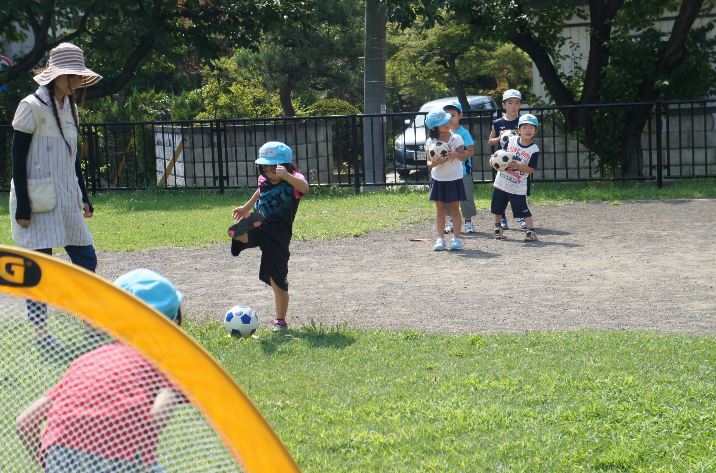 9月2日(金)年長すみれ組がサッカー教室(2回目)に参加しました。前日から楽しみにしていた子どもたちは、コーチの話をよく聞いて、元気いっぱい体を動かしていました。前半は、バランス感覚を養う動きやゲーム遊びを色々楽しみ、笑顔が溢れていました。休憩と水分補給を間に挟み、後半は、シュート練習と男女に分かれて試合を行ないました。女の子チームにバンバンゴールを入れられ、悔しがっていた男の子たちでした(笑)。女子恐るべし。
