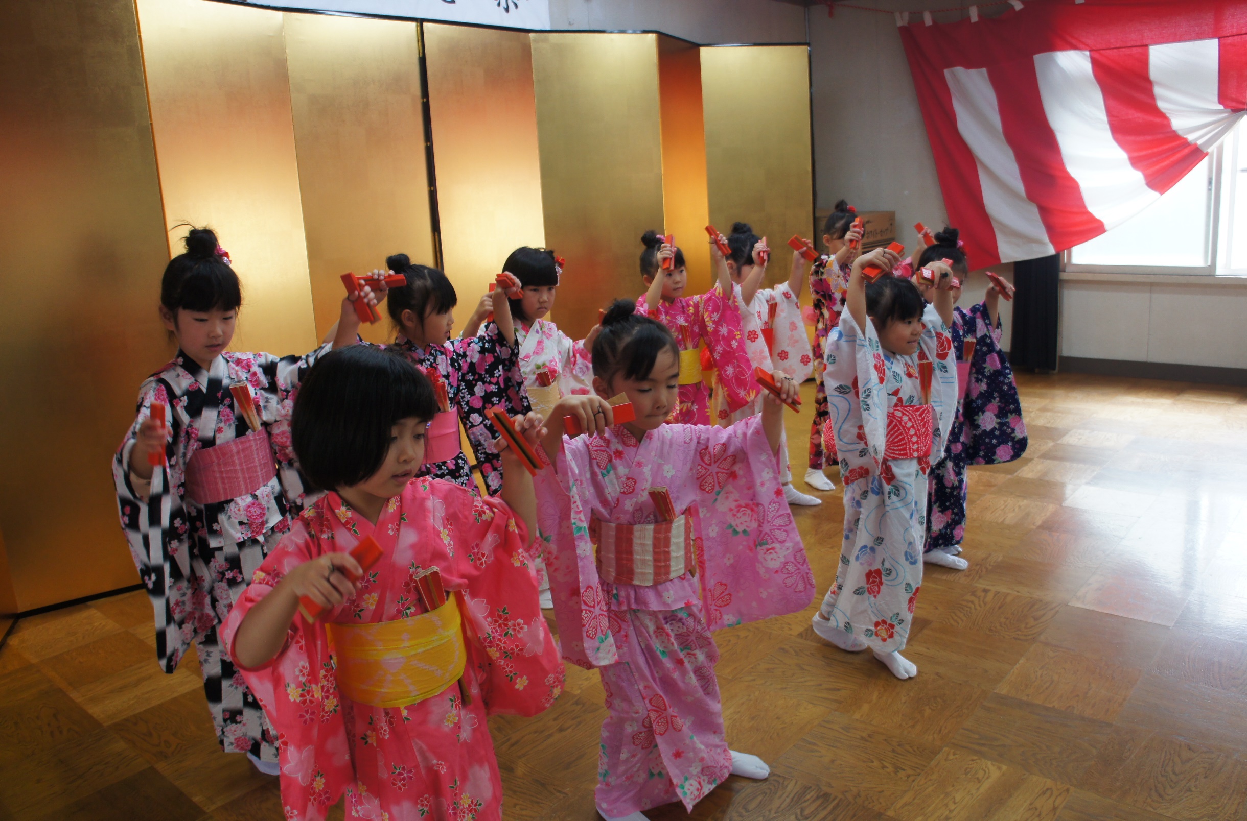 9月17日(土)年長すみれ組が、桜ヶ丘町会の敬老会で、日本舞踊を披露してきました。少し緊張した表情になっていましたが、女の子の浴衣姿や男の子の袴姿、子ども達が頑張って踊っている姿に、おじいちゃん、おばあちゃんたちは満面の笑顔で見ていましたよ。子ども達もたくさん拍手をもらえて、とても嬉しそうでした。